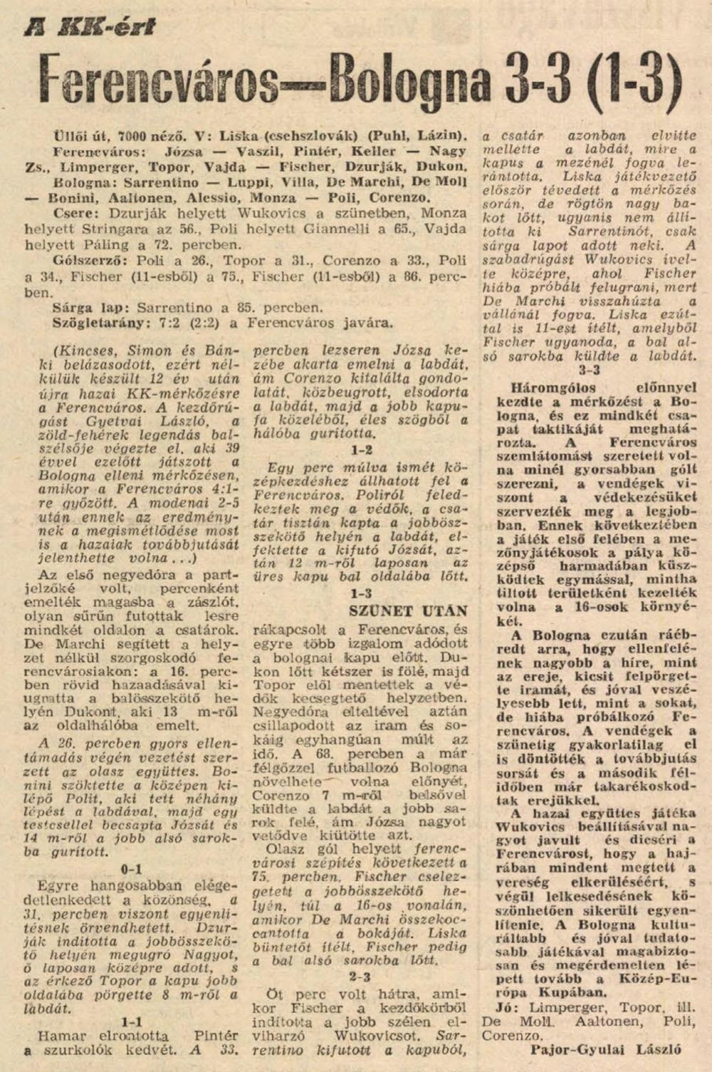 Csaknem fél évszázad után ismét Közép-európa Kupa mérkőzésen találkozott szerdán délután az Üllői úton stadionban a Ferencváros és az olasz Bologna együttese. Az első összecsapást október 20-án Modena városában rendezték, ahol az itáliai csapat 5:2 arányban győzött. A visszavágón a reménytelennek tűnő helyzet és a csípős hideg, úgy tetszik, kissé kedvét szegte a szurkolóknak, csupán mintegy 7.000 néző foglalt helyet a lelátón, amikor a csapatok a csehszlovák Rudolf Liska játékvezetővel az élen a következő összeállításban futottak ki a pályára: