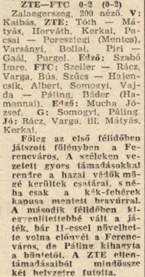 ZTE: Huszár – Molnár, Szabó, Balog, Rezi – Szalai, Rózsa, Wittmann, (Tasi 46.), Vadász (Farkas 55.) – Kámán, Kovács L.
