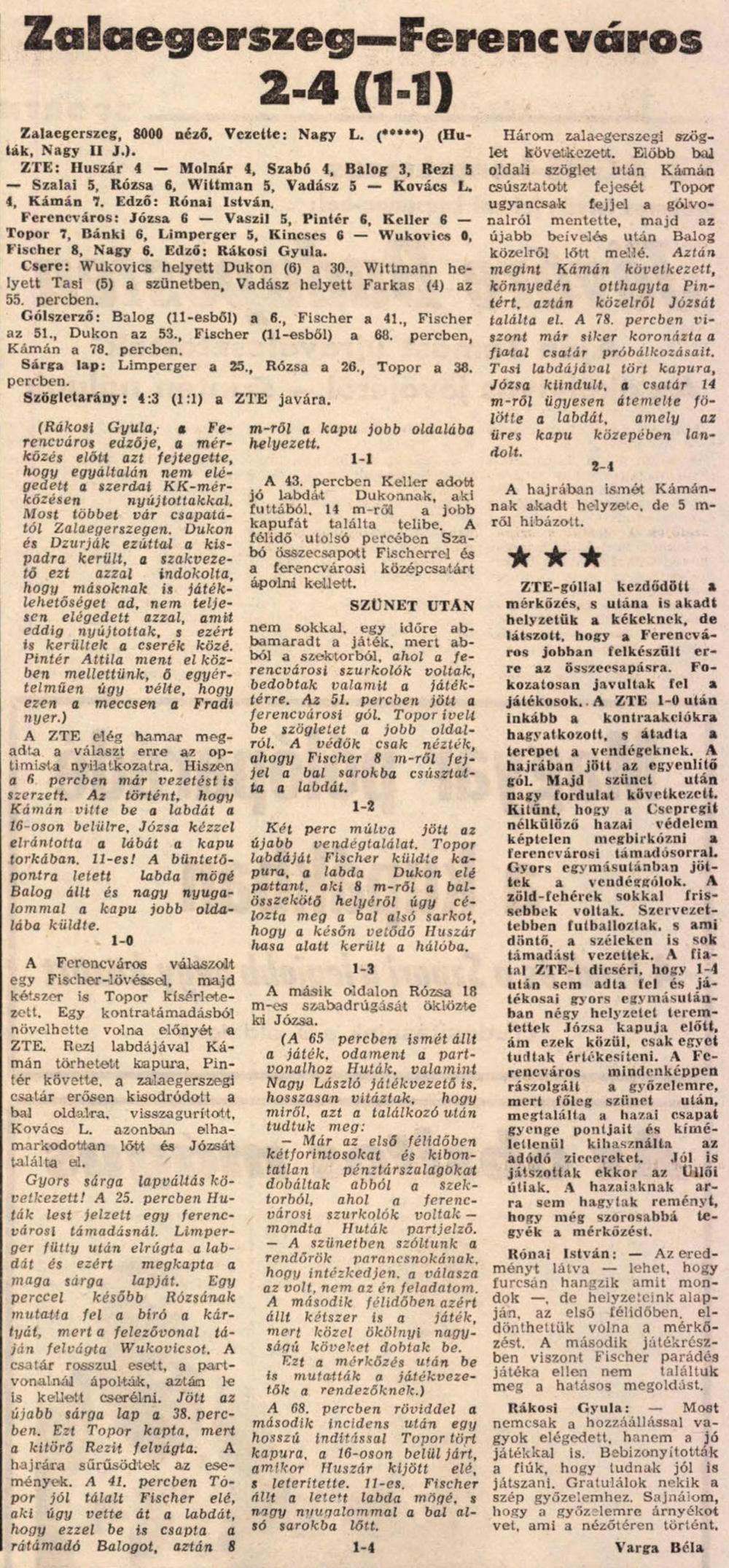 Végig nagyiramu küzdelmes, de csak közepes szinvonalu mérkőzésen a ZTE-t tulságosan megnyugtatta a korán megszerzett előny. A fokozatosan belelendülő Ferencváros a szünet előtt váratlanul egyenlitett, a második félidő elején pedig nagyon gyorsan és megérdemeten a maga javára forditotta a mérkőzést.