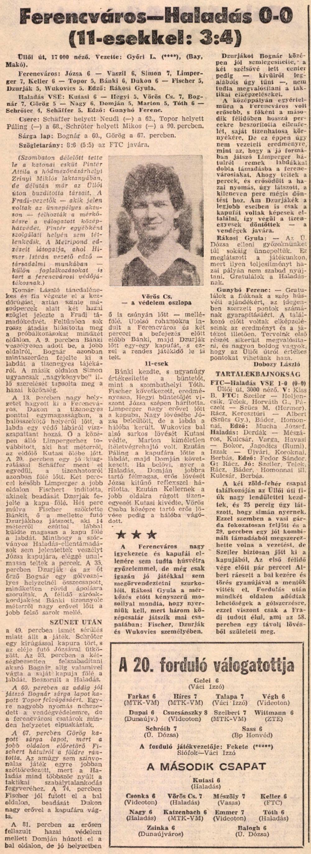 Alig érthető, hogy a két szombathelyi támadóra miért ügyelt mindvégig négy hazai védő. Pedig a ferencvárosi szakvezetésnek illett volna észrevennie, hogy Limperger igen jó formában van, többnyire pontosan indít, ennek ellenére a hórihorgas védőt „lekötötték” embervédelemre. Ez a passzív ferencvárosi taktikai felfogás volt az oka annak, hogy a Haladás a középpályán többnyire szabadon ellenőrizhette a labdákat, és ezzel levette a terhet közvetlen védelme válláról. A Haladás szilárd taktikai fegyelemmel eljutott a 11-es rúgások jogáig.