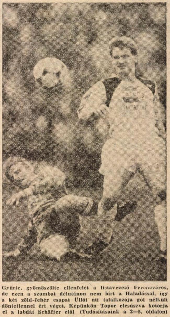 Fordulás után az első negyedórában a ferencvárosiak nagy tempót diktáltak, voltak is lehetőségeik. Az 54. percben Dukon cseles beadását Bognár csaknem a saját kapujába ,,mentette,,. A nagy vész időszakát a Haladás sikerrel túlélte, mert lelkesen, és jól tömörítette hátsó alakzatait. A 74. percben Fischer a baloldalon próbálkozott, és ez jó ötlet volt, hiszen pontosan tálalt Dukon lábára, akinek kapáslövése a felső léc alsó lapjáról vágódott visszaa mezőnybe, és a Haladás-védők menteni tudtak. A 89. percben egy hazai lövés kipattant Kutasiról, Dzurják 6 méterről ismételhetett, ám az üres kapu helyett a felső lécet találta el.