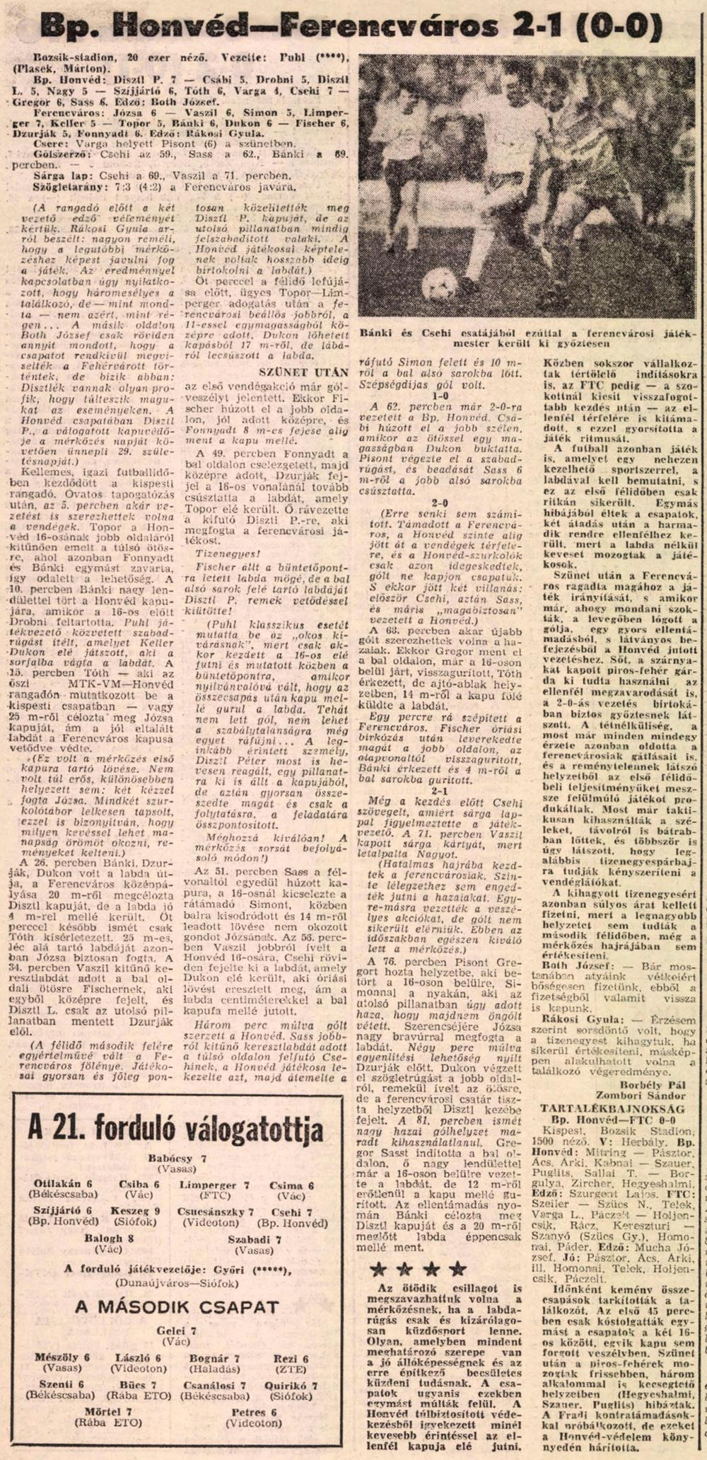 Bp. Honvéd: Disztl P. – Csábi, Disztl L., Drobni, Nagy S. – Szijjártó, Varga (Pisont 46.), Csehi – Gregor, Tóth, Sass