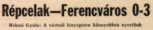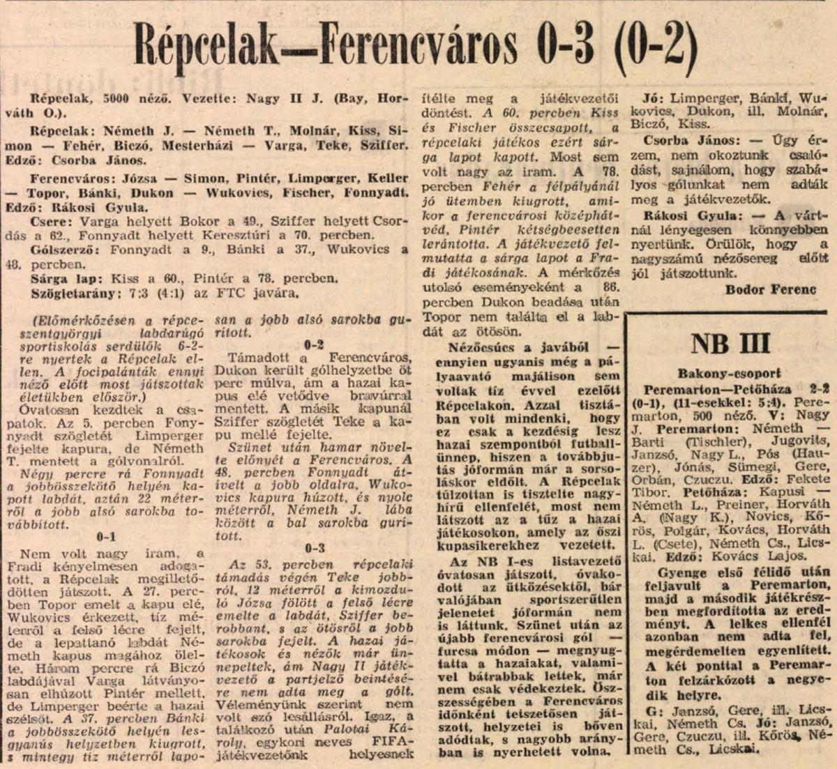 A 9. percben Fonnyadt a jobbösszekötő helyén kapott labdát, aztán 22 m-ről a jobb alsó sarokba lőtt (1:0). Nem volt nagy az iram, az FTC kényelmesen adogatott, mig a Répcelak teljesen megilletődötten futballozott. A 37. percben Bánki a jobböszekötő helyén lesgyanus helyzetben kiugrott, s mintegy 10 m-ről laposan a kapu jobb alsó sarkába továbbitott (2:0).