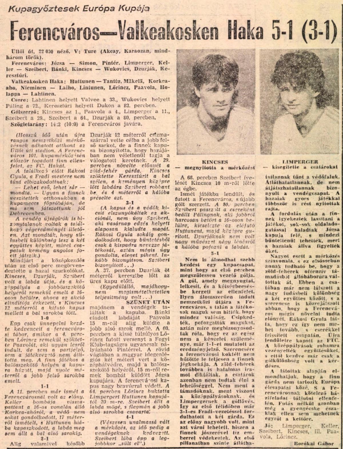 A zöld-fehér legénység ötödik KEK-rajtja tehát fölöttébb jól sikerült. A gólok mellett akadtak más, igencsak szemet gyönyörködtető megoldások, ám Rákosi Gyula megjegyezte: olyan tökéletes helyzetekért, amelyeket kihagytak a játékosok, még edzőmérkőzésen is szídás jár. A Ferencváros kedden huszadik KEK-találkozóján lépett pályára, a tizedik győzelmét harcolta ki. Ennél nagyobb arányban a kupagyőztesek tornáján csak egyszer diadalmaskodott, az 1972/73-as kiírásban. Napra pontosan 1972. szeptember 28-án a Népstadionban 6:0 (3:0) arányban legyőzte a máltai Floriana La Vallettát. Az Üllői úti csapat egyébként a KEK-ben egyszer már megmutatta oroszlánkörmeit, az 1974/75-ös idényben döntőig jutott, s bár ott 3:0-ra kikapott a Dinamo Kijevtől, az az ezüstérem azóta is szépen csillog. A 90 perc után a finn öltözőben nyoma sem volt letörtségnek. A Haka azt nyújtotta, amit tud. Becsületesen, az utolsó percig küzdött. Ha tíz gólt kap, akkor is arra törekszik, hogy az utolsó támadás azért az övé legyen Ez a szimpatikus csapat – Lőrincz kivételével – csupa amatőr játékosból áll. Ledolgozzák a maguk nyolc óráját, s utána – vagy sokszor előtte – megjelennek az edzéseken.