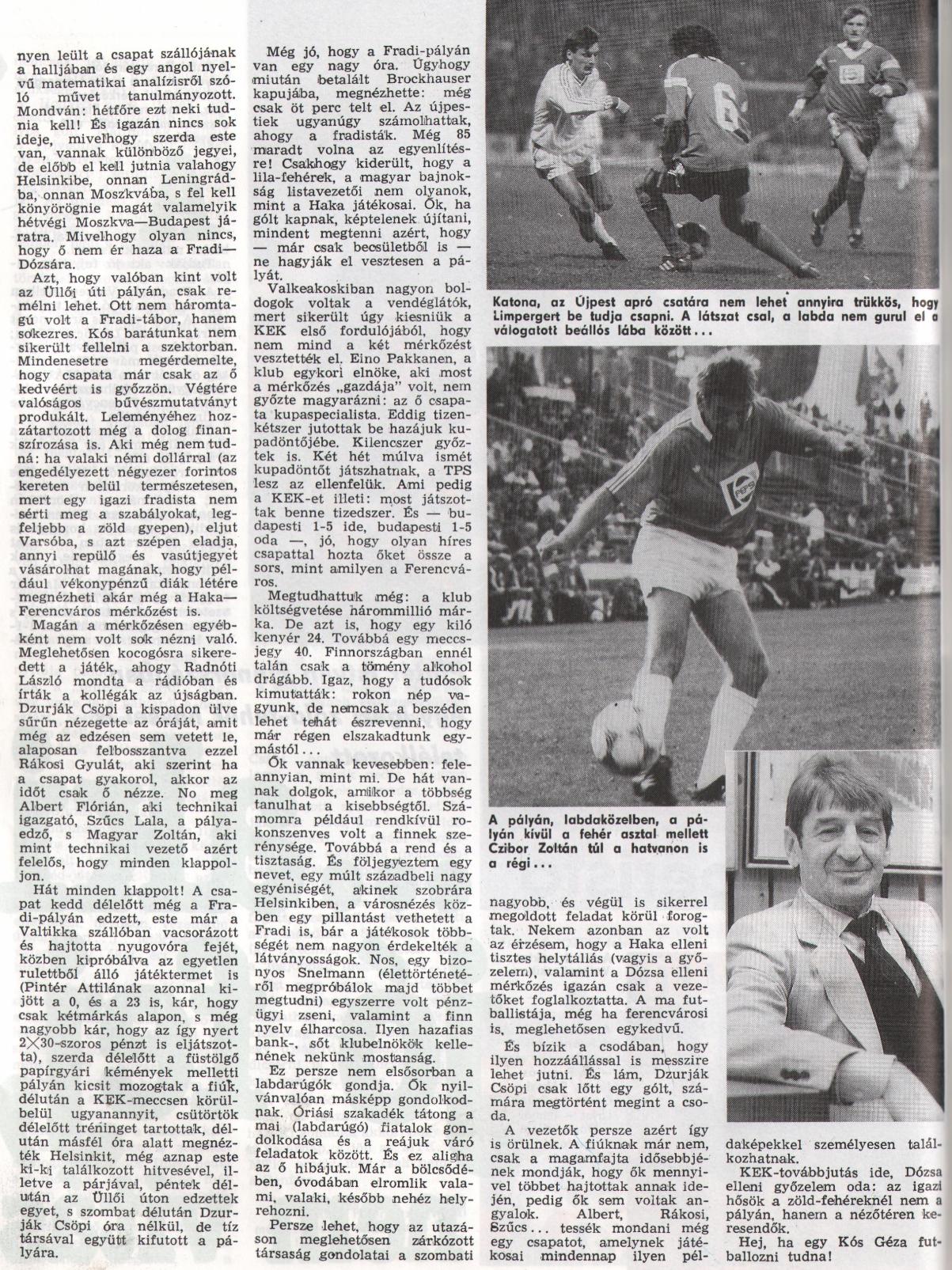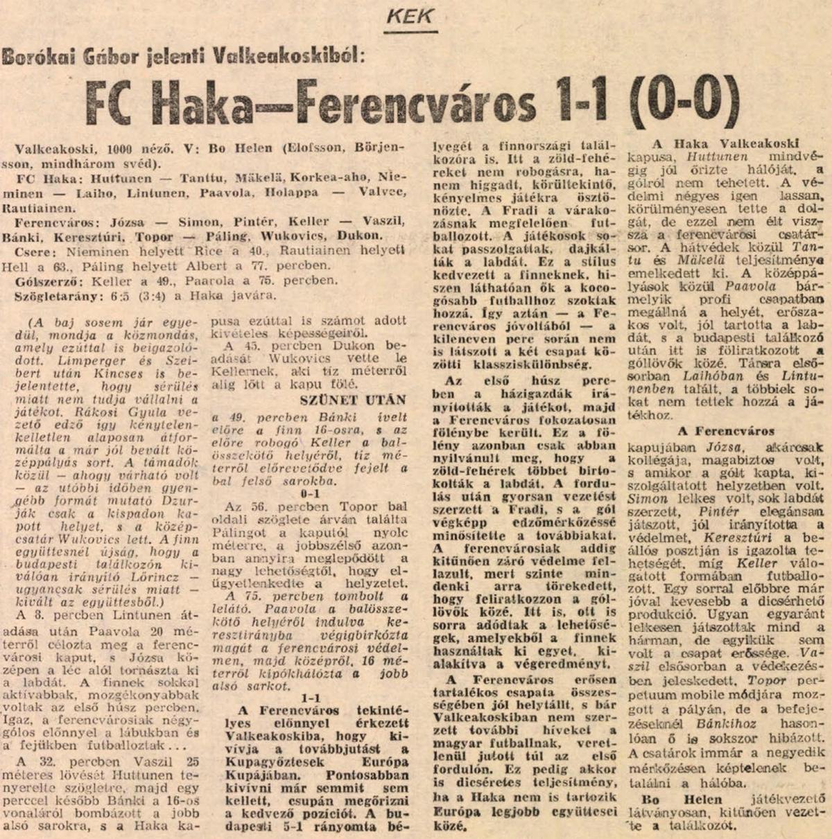 A Ferencváros tekintélyes előnnyel érkezett Valkeakoskiba, hogy kivívja a továbbjutást a KEK-ben. A budapesti 5:1 rányomta a bélyegét a finnországi találkozóra. A Fradi a várakozásnak megfelelően futballozott, a játékosok sokat passzolgattak, dajkálták a labdát, és ez a stílus kedvezett a finneknek, hiszen ők láthatóan a kocogósabb futballhoz szoktak hozzá. Igy aztán nem is látszott igazán a két csapat közötti klassziskülönbség. Az első húsz percben a házigazdák irányították a játékot, majd fokozatosan feljött a Ferencváros. A fordulás után gyorsan vezetésté szerzett a Fradi, s a gól végképp edzőmérkőzéssé minősítette a továbbiakat. A Ferencváros erősen tartalékos csapata összességében jól helytállt, s bár Valkeakoskiban nem szerzett további híveket a magyar futballnak, veretlenül, 6:2-es összesítéssel jutott túl az első fordulón.