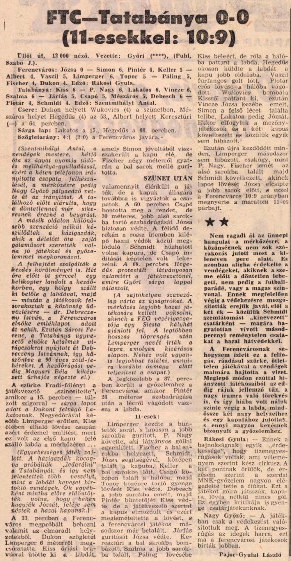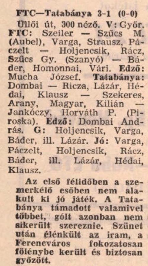 Azt, hogy a labdarúgó NB I. pontvadászata hajráidőszakát éli, nem lehetett látni az első félidőt szemlélve. Mindkét együttes szemmel láthatóan úgy tekintette ezt a játékrészt (s mint utóbb kiderült, az egész összecsapást is), mint egy szükséges rosszat. A játékosok unottan terelgették a labdát, a tatabányaiak az első félórában a ferencvárosi kapu előterébe sem jutottak el. Csakis arra törekedtek, hogy erősítsék hátsó alakzataikat. Ez felettébb egyszerű dolog volt, mert a zöld-fehérek semmiféle veszélyt nem jelentettek a vidékiek kapujára. Egyetlen kivétel: a 33. percben Dukon jobboldali szögletét Limperger az ötös sarkáról ügyesen csúsztatta fejjel a kapu felé, de Kiss látványos reflexmozdulattal szögletre mentett. Alig húsz másodperc múlva Fischer az ötösön egyedül álldogált, de gyatrán az oldalvonal irányába rúgta el a labdát ahelyett, hogy gólt rúgott volna.
