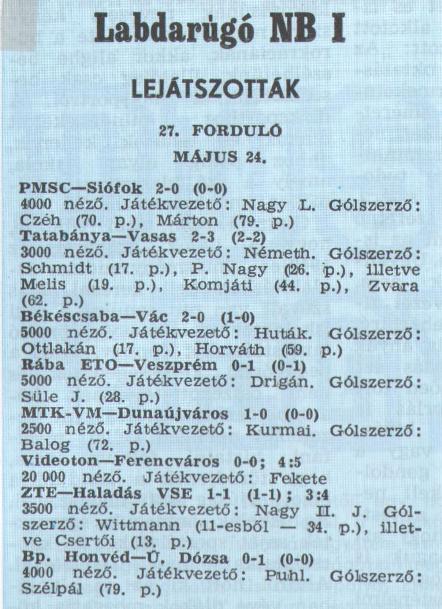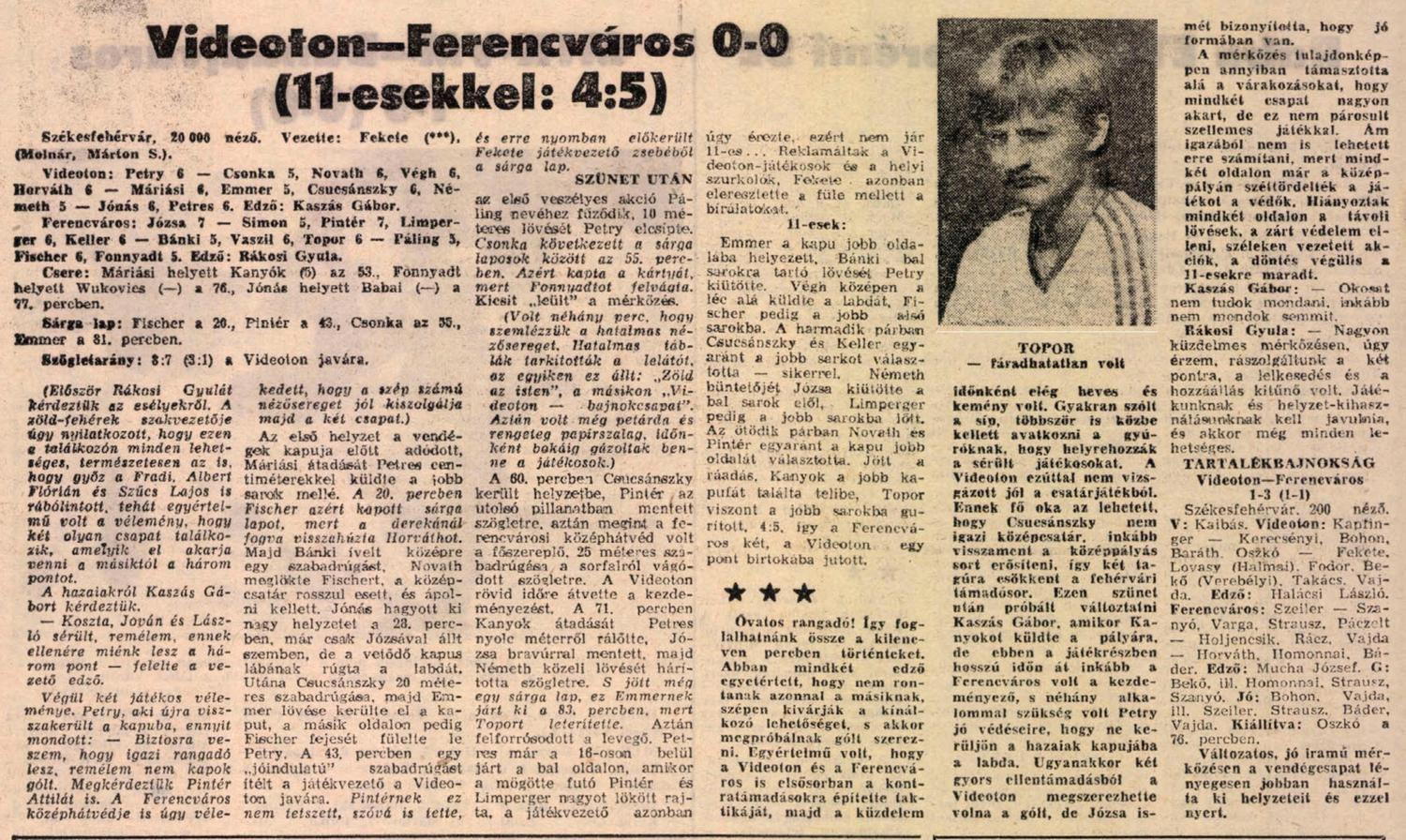 Videoton: Petry – Csonka, Novath, Végh, Horváth – Máriási (Kanyok 53.), Emmer, Csucsánszky, Németh – Jónás (Babai 78.), Petres