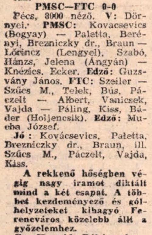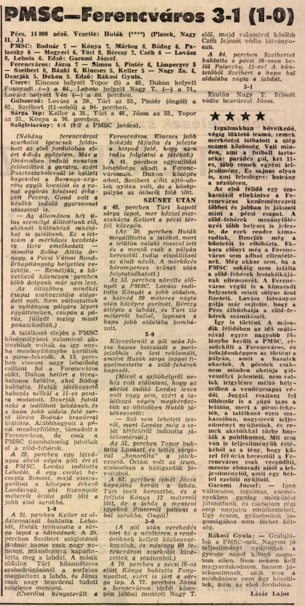 Pécsi MSC: Bodnár – Kónya, Márton, Bódog, Palaczky – Megyeri, Turi, Bérczy, Czéh – Lovász, Lehota (Nagy T. 74. p.)