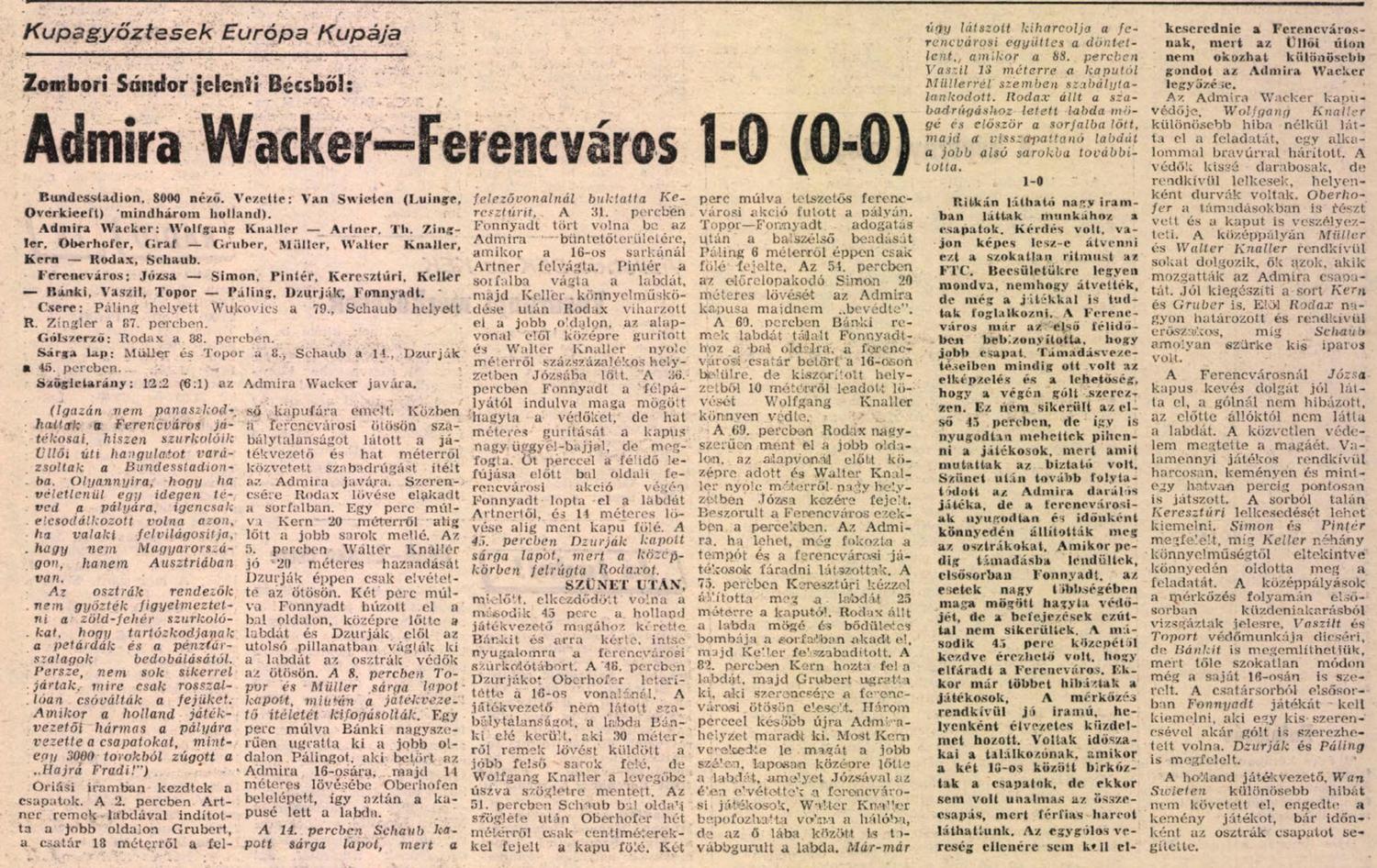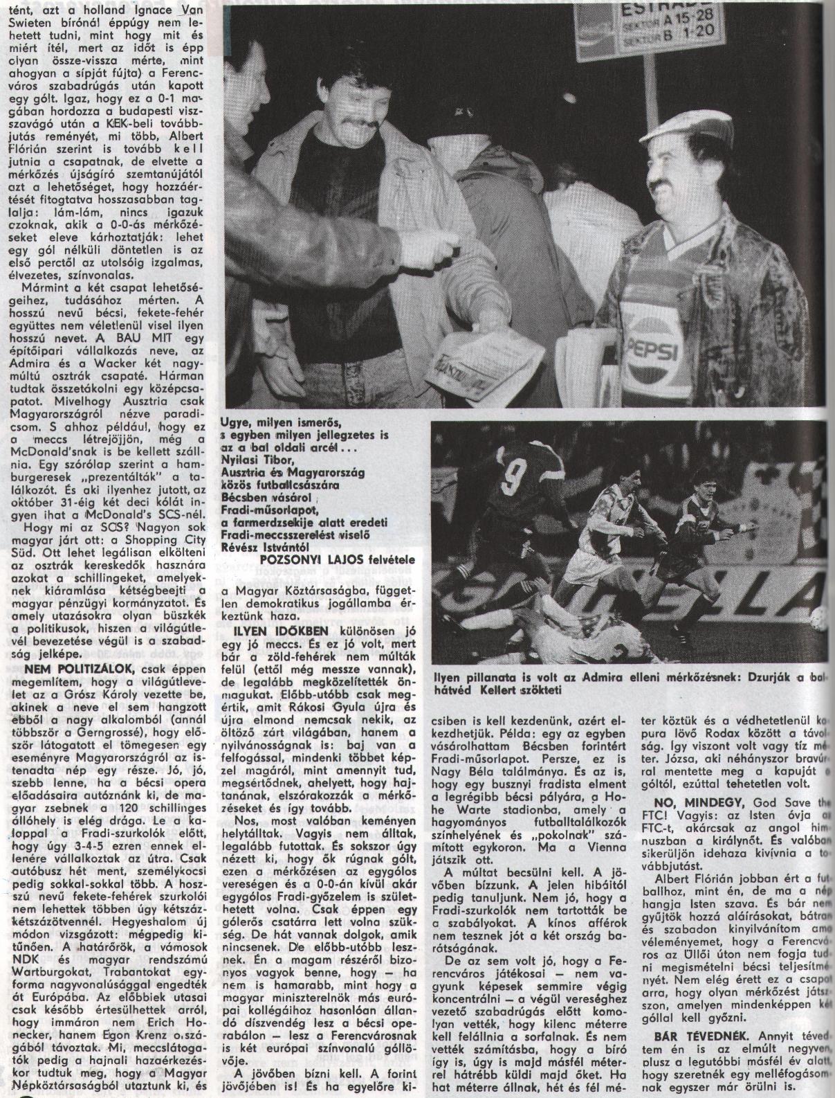 – Amikor az osztrák televízió összeállításában megnéztem, milyen gólt kaptunk az utolsó előtti percben, nagyon dühös lettem. – A szabadrúgás utáni lökdösődésben az Admira játékosa, Rodax megtalálta a rést, s ezzel nehezebb helyzetbe hozott bennünket. Ennek ellenére szerintem idehaza ki tudjuk harcolni a továbbjutást, bár minden lehetséges, hiszen a két csapat nagyjából egyforma képességű.