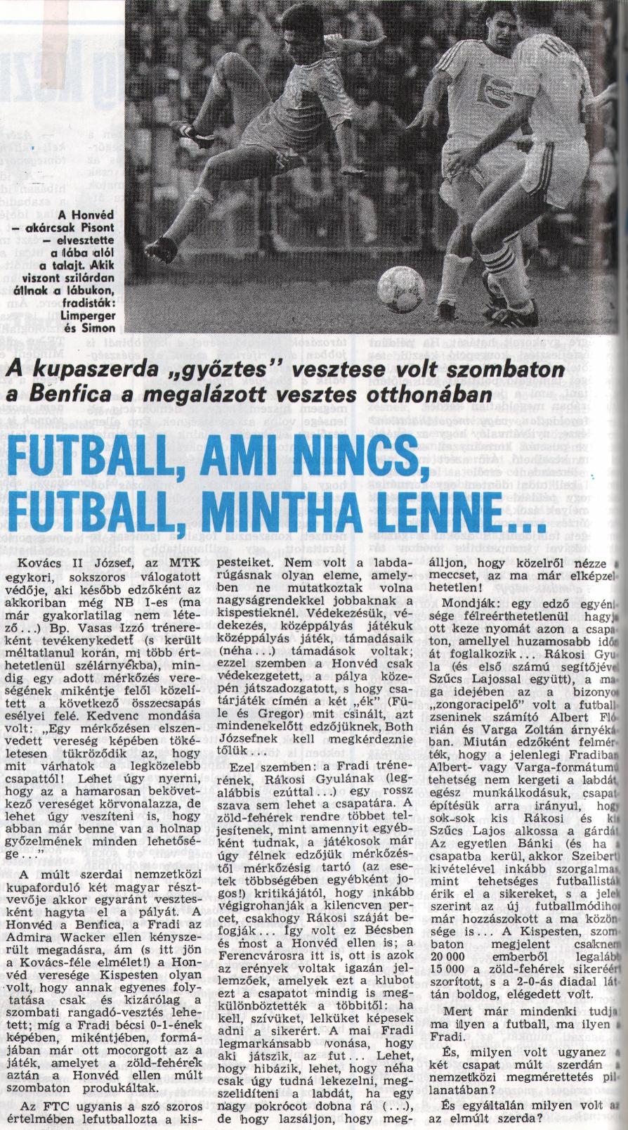 A bajnokság végére fel is kapaszkodtunk az ötödik helyre, sőt a következő 1988/89-s szezon hat év után már érmet hozott, így a „rendszerváltás bajnokságától” már nagyon fényes érmet vártunk. Az 1989. október 21-i, Honvéd elleni rangadó előtt két ponttal voltunk lemaradva az első helytől. Megnehezítette a csapatok helyzetét, hogy 3 nappal (!) a bajnoki mérkőzés előtt a Honvéd otthon fogadta a Benficát, a Fradi meg Bécsben lépett pályára a KEK második fordulójában az Admira Wacker ellen. A Honvéd simán kikapott 2:0-ra (igaz, sokkal nevesebb volt az ellenfél), és Bécsben mi is vereséget szenvedtünk, de az egygólos hátrány behozhatónak tűnt (sajnos a visszavágón is kikaptunk, ezzel véget is ért a nemzetközi szereplésünk).