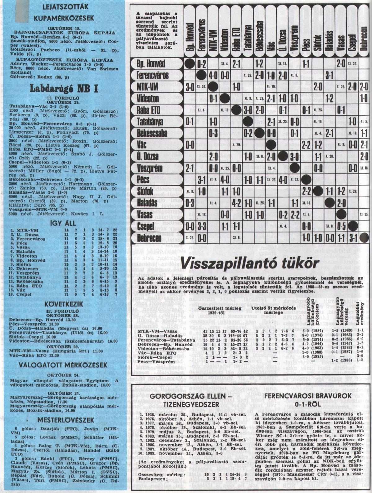 Közelmúltunkban ritkán fordult elő, hogy a történelem körbeöleljen egy bajnoki mérkőzést. Sokan talán még azt is vitatnák, hogy 25 év távlatából lehet-e történelemről beszélni, és itt nem elsősorban az évek miatt, hanem az azóta eltelt időszak politikai történései miatt. Pedig akkor, 1989 októberében már az ajtónk előtt toporgott a szabadság semmivel sem pótolható lágy fuvallata. Fiatalok voltunk és lelkesek, nyáron már szabadon skandáltuk, hogy „ruszkik haza”, rogyadozott a negyven éves kommunista rezsim, október elején fel is oszlatta magát az MSZMP, és 18-án Szűrős Mátyást megbízták a köztársaság elnöki feladatok ellátásával, rá öt nappal meg kikiáltotta a Magyar Köztársaságot. Megközölve a két dátumot, október 21-én meg a Bozsik stadionban simán vertük a Budapesti Honvédot.