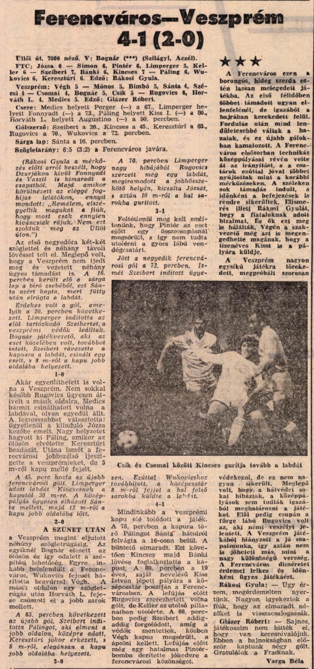 Fordulás után nem sokkal a veszprémiek előtt adódott ígéretes helyzet egy beadás nyomán, de ez kihasználatlanul maradt. Az 59. percben Wukovics fejese szinte gólnak látszott, de Végh nagyszerűen rugaszkodott el, és a jobb sarok előtt megfogta a labdát. A következő ferencvárosi találatra a 64. percig kellett várni: nagyszerű kombináció végén Páling labdáját Keresztúri lőtte a veszprémi kapuba (3:0). Nem sokkal később Limperger hibázott, és Rugovics egyedül sétálhatott a 16-oson belülre, majd a kifutó Józsa mellett szépitett (3:1). A bekapott gól ellenére a hazaiak helyenként ügyes kombinációkkal, végig fölényben játszottak, s ez újabb találatot eredményezett. A 73. percben Szeibert ívelését Wukovics befejelte (4:1).