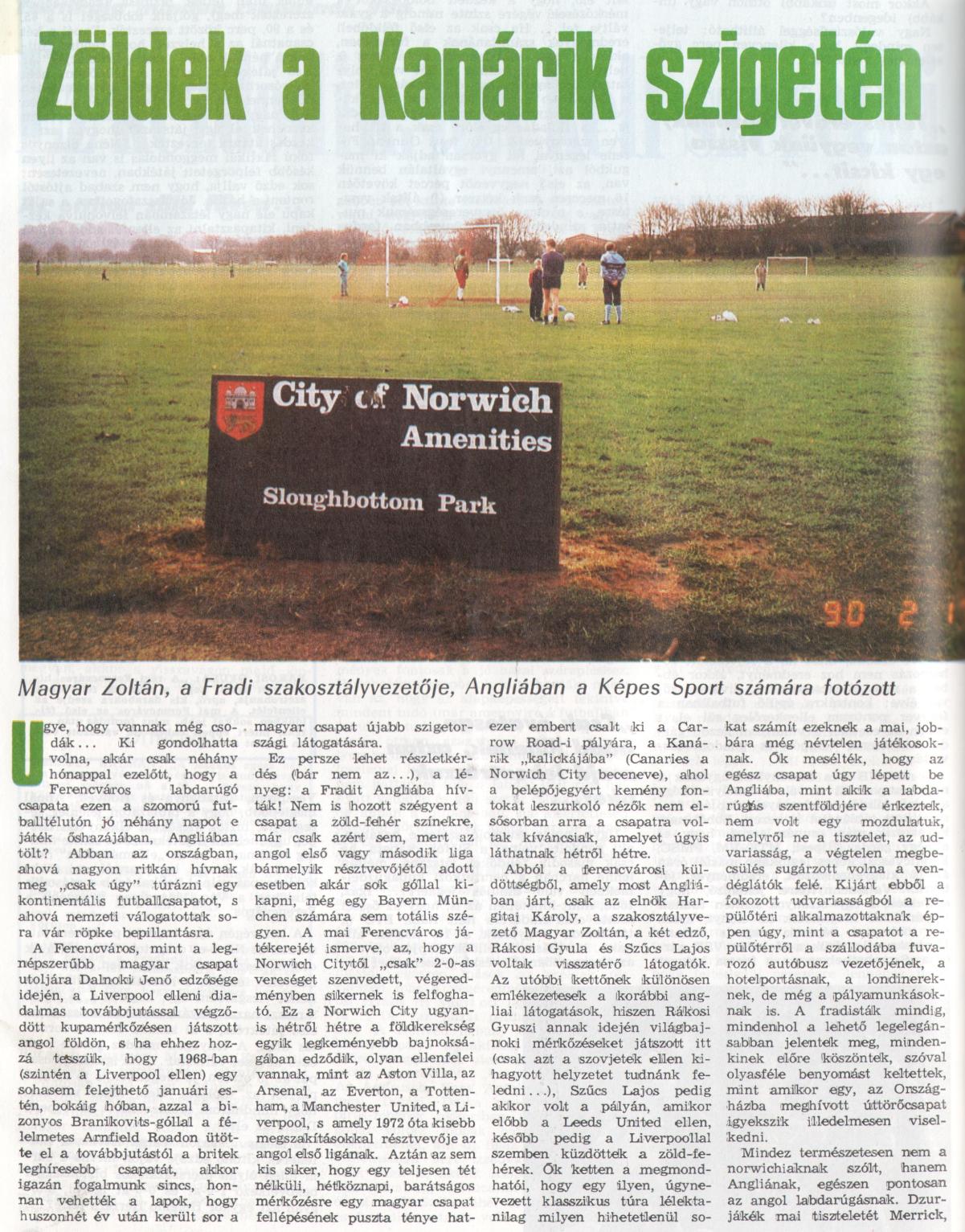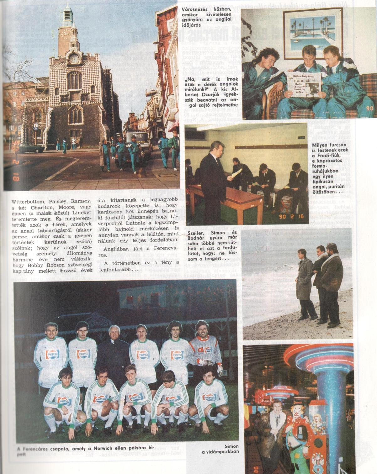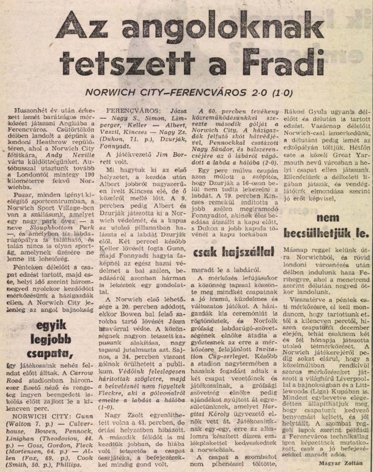 Sűrű program elé néznek a ferencvárosi labdarúgók. Csütörtökön angliai meghívásnak tesznek eleget. Norwichba utaznak, ahol az első ligás City vendégei lesznek, s igyekeznek még egy erőpróbával gazdagítani szigetországi tartózkodásukat. Rákosi Gyula vezető edző a következő játékosokat jelölte az utazó keretbe: Józsa, Szeiler, Simon, Vaszil, Limperger, Keller, Dukon, Dzurják, Nagy S., Fonnyadt, Nagy Zs., Kincses, Kiss, Telek, Albert, Vanicsek, Sipeki.