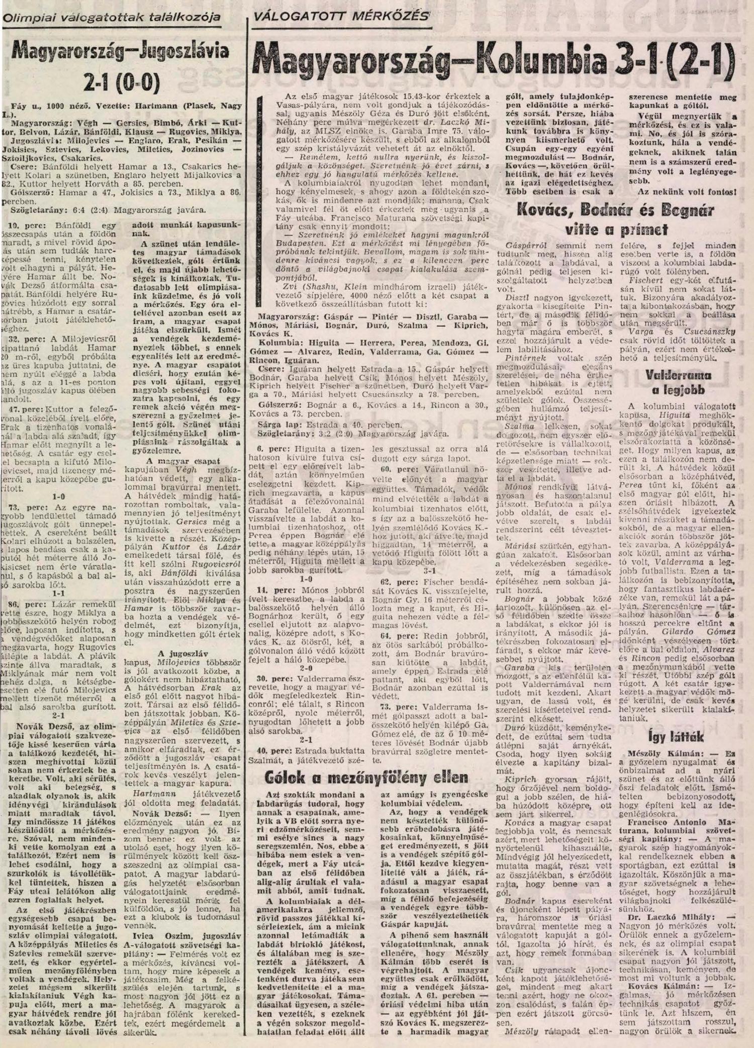 Ezek tudatában valóságos csoda, hogy a sokkal többet futó vendégek a szünetig nem tudtak kiegyenliteni. Fordulás után az volt a kérdés, birja-e a sürün permetező kolumbiai rohamok széttördelését a magyar védelem? Negyed óráig tartani lehetett attól, hogy nem. Szerencsére, ismét jött a zseniálisan játsszó Kovács, belőtte a magyar válogatott harmadik gólját, és hogy a hazai csapat végül is nyerhetett, az legnagyobbrészt az Auxerre légiósának köszönhető. Megjegyzendő: a magyar válogatott olykor nem kicsiny erőnléti hátrányát azzal tudta ellensulyozni, hogy a mérkőzés során fél csapatra való játékost cserélt. Ezzel együtt is le a kalappal a hazai együttes előtt, mert hiszen hétfőn három gólt lőtt az Egyesült Arab Emirségeknek, most ugyanennyit Kolumbiának. Márpedig e két utóbbi válogatott ott lesz az olaszországi vb döntőben…