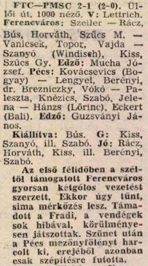 Ferencváros: Józsa – Nagy S., Simon, Limperger, Keller – Szeibert, Vaszil, Kincses – Nagy Zs., Dzurják, Fonnyadt