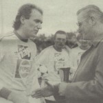 KS_1990_I_01_0035-19900303Az első Üllői úti szurkolói 11-es „párbajt” egy vidéki és egy budapesti fradista végezte. Csontos Attila az „Attila” mosoda tulajdonosa, Király Győző pedig az iklódbördőceiek „küldötte”. A Győző szó ezúttal igaznak bizonyult, ugyanis Király győzött a rendhagyó párbajon: 3-1-re. Néhány szó az első 11-es „bajnokról”: öt éve a Baráti Kör tagja és a 250 km-es távolság ellenére időnként ellátogat az Üllői útra. Veszprémben is ott ünnepelte a lelátón a tavalyi ezüstérmes csapatot. Sőt a nyári nemzetközi tornán is tapsolta Kellerékkel. Egyébként Keller Jóska a kedvence – a 11-es párbaj győzelemért járó fotó lehetőségénél is ővele kérte a közös szí­nes fényképezést. Azóta már bizonyára örömmel mutatja iklódbördöncei barátainak a szép szí­nes fényképet… Élete egyik szó szerinti szí­nes Üllői úti emlékét.