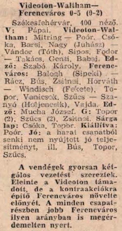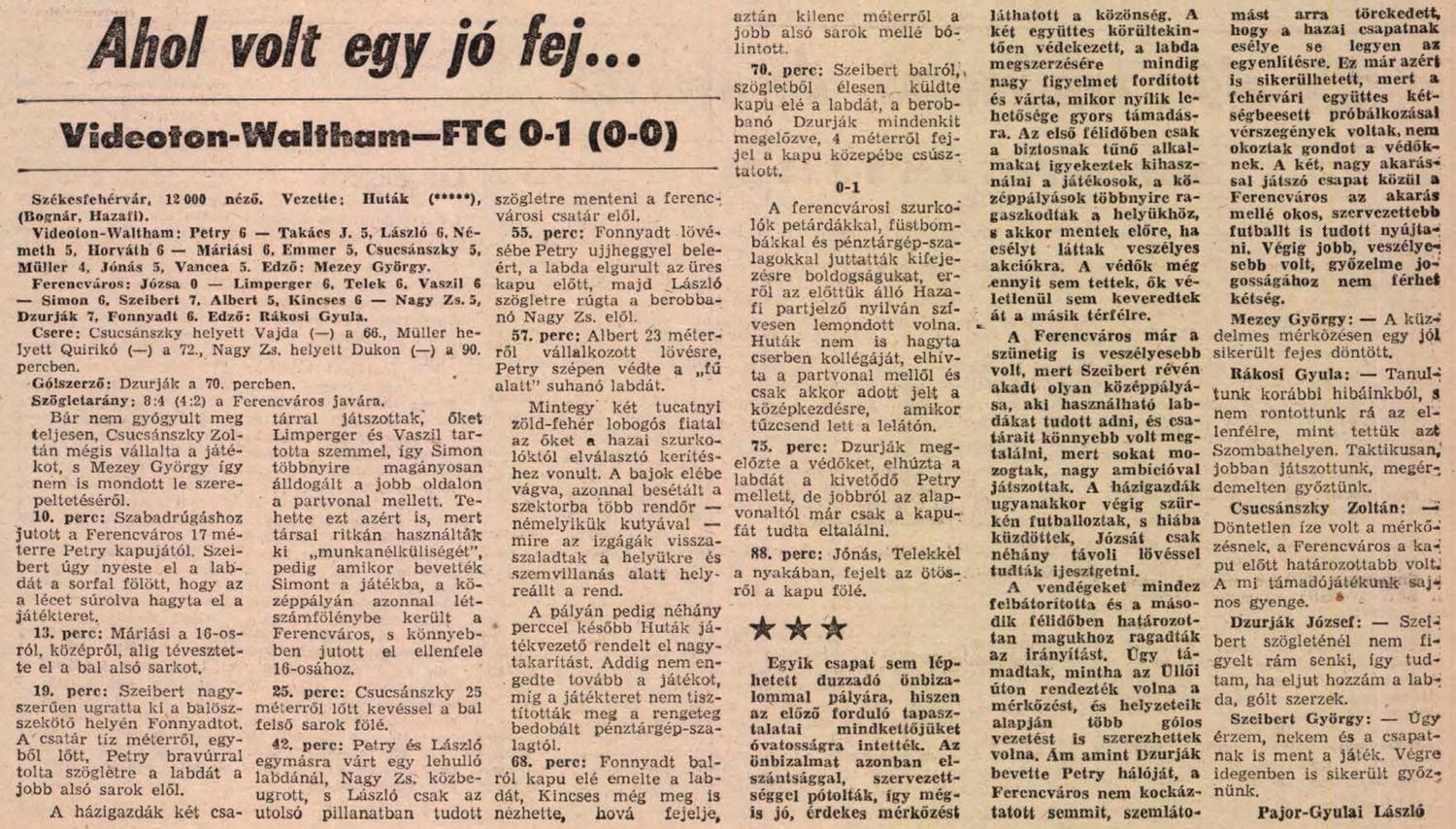 Videoton-Waltham: Petry – Takács J., László, Németh, Horváth – Máriási, Csucsánszky (Vajda 66.), Emmer, Müller (Quirikó 72.) – Jónás, Vancea
