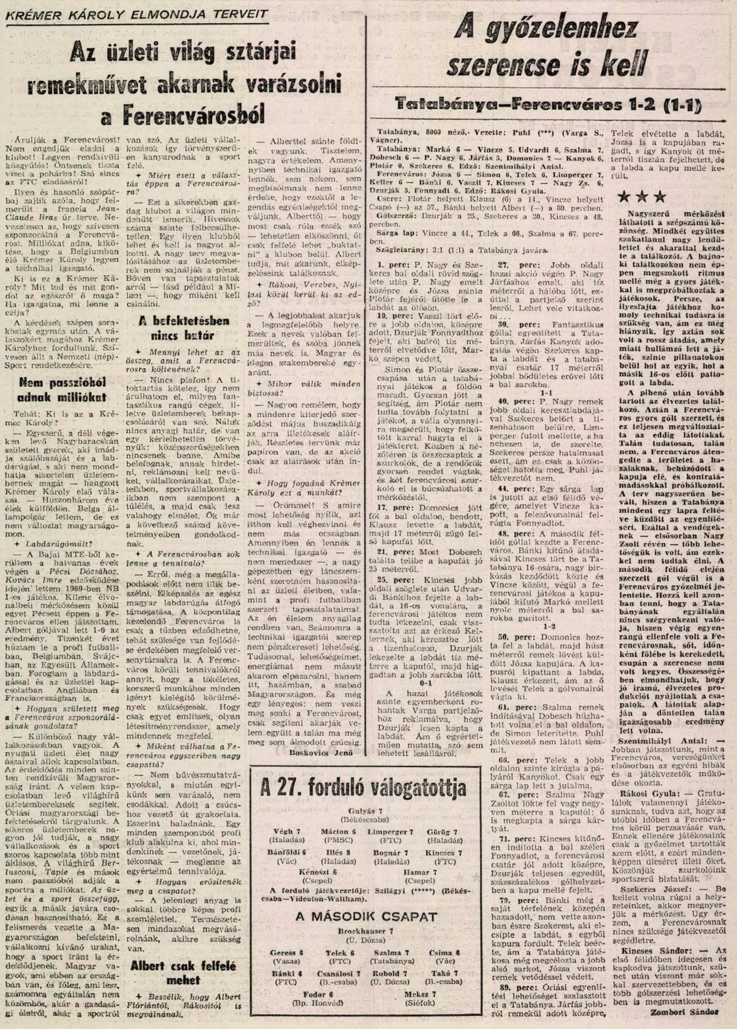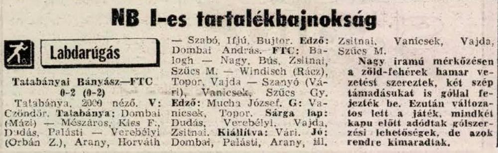 A mérkőzés előtt kiderült, hogy Szentmihályi változtatott a tervezett csapaton, Klausz és Lázár a kispadon foglalt helyet, míg Vincze és Plotár kezdőember lett. A nyitányban rögtön Józsának volt egy kis feladata, mert Domonics éles lövését kellett kiöklöznie. A 11. percben Bánki jó átadása után Fonnyadt kapásból lőtt kapura, Markó azonban háritott. Két perc múlva Simon Plotárral csapott össze ugy, hogy a tatabányai csatárt le kellett cserélni. A 19. percben Domonicsot letalpalta Simon, az ujabb eseményt a 22. percben Dobesch kapufája jelentette. Három perccel később mégis a másik oldalon esett a gól. A 25. percben jobboldali szöglet után a védők röviden szabadítottak fel, Bánki a jobb összekötő helyén, lesgyanús helyzetben Dzurják elé adott, aki 12 méterről a kapu jobb oldalába helyezett (1:0). Öt perc múlva Járfás, Kanyok, Szekeres volt a labda útja, amikor a balszélső a középcsatár helyéről bődületes gólt lőtt a bal alsó sarokba (1:1). A 42. percben Limperger próbált a Fradinak előnyt szerezni, de lövését védte Markó.