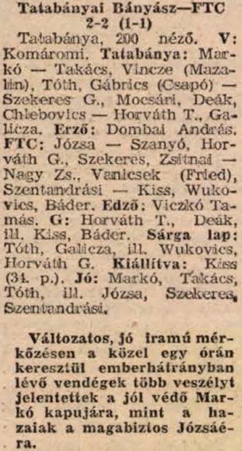 Tatabánya: Tőkés – Hegedűs, Váczi, Udvardi, Kiss (Lázár 6.) – Járfás, Simon, Klausz – Kanyok, Kiszi, Szekeres (Horváth I. 66.)