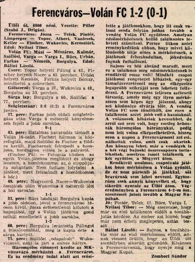 A gyenge iramú, unalmas mérkőzést a Ferencváros félgőzzel játszotta végig. Csupán a Volán vezető gólja után lángolt fel néhány percre a küzdelem, majd fordulás után hajtott is öt percen keresztül a zöld-fehér csapat… Borgulya furcsa gólja után – a 16-os sarkáról emelte a kapuba a labdát a védők és a kifutó Józsa kapus felett – a Volán nem törekedett újabb találatokra, a