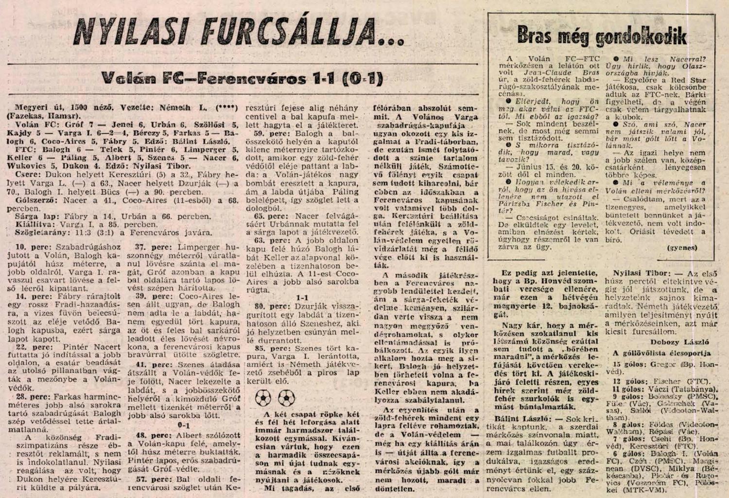 Sokáig ugy tünt, hogy a gyanakodóknak van igazuk, mert az eső áztatta játéktéren békés labdázgatás folyt. Egy Varga-kapufát leszámitva az első 40 percben nem sok emlitésre méltó esemény történt. Aztán a 41. percben Szenes labdájával Nacer a jobboldalon huzott kapura, s 8 m-ről a hosszu sarokba lőtt (0:1). Rögtön utána Wukovics jobboldali beivelését Kereszturi fejelte kapura, Gróf bravurral szögletre mentett. A sarokrugás után Nacer előtt kinálkozott nagy helyzet, de az ötösön belül nem találta el a labdát.
