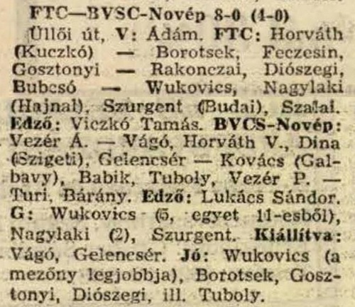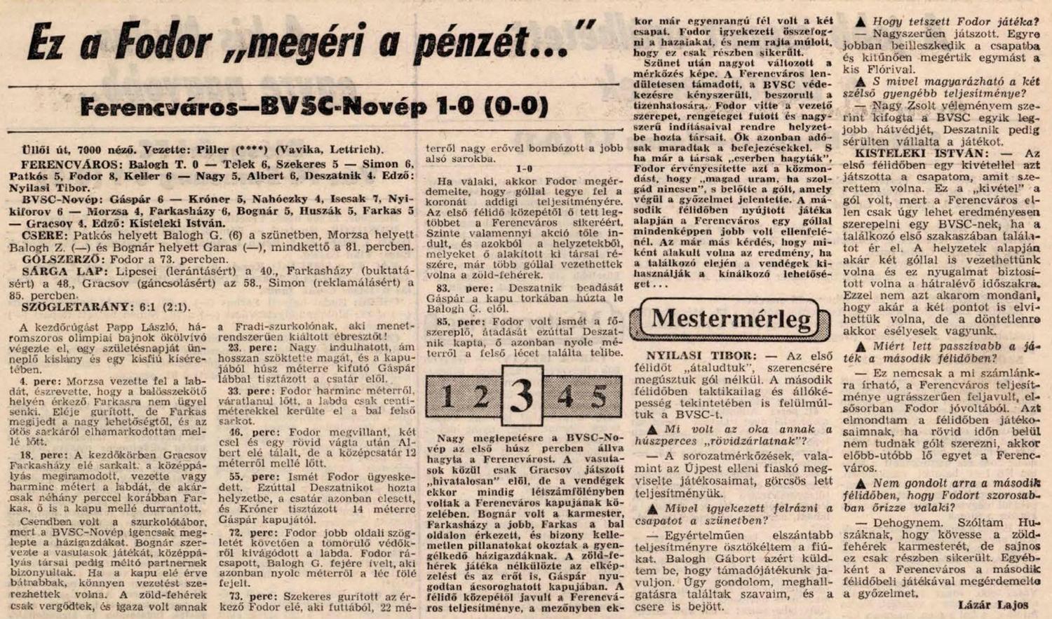 Az FTC—BVSC-Novép NB I-es labdarúgó-mérkőzés összeállításából sajnálatos módon kimaradt Lipcsei neve és osztályzata: a középpályás 6-ost kapott.