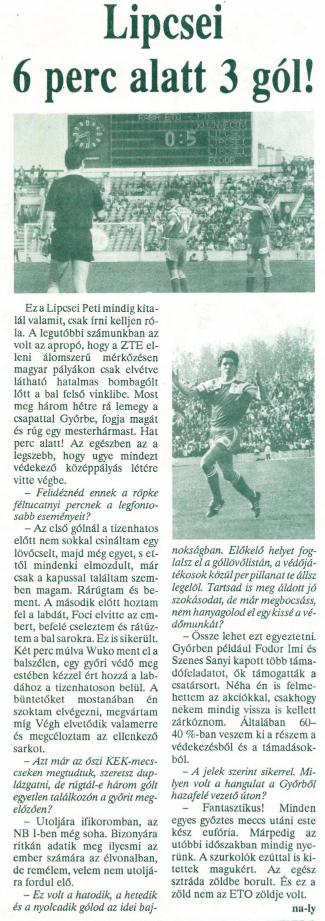 Az első gólnál a tizenhatos előtt nemsokkal csináltam egy lövőcselt, majd még egyet, s ettől mindenki elmozdult, már csak a kapussal találtam szemben magam. Rárúgtam és bement. A második előtt hoztam fel a labdát, Foci elvitte az embert, befelé cseleztem és rátűztem a bal sarokra. Ez is sikerült. Két perc múlva Wuko ment el a balszélen, egy győri védő meg estében kézzel ért hozzá a labdához. A büntetőket mostanság én szoktam elvégezni, megvártam míg Végh elvetődik valamerre és megcéloztam az ellenkező sarkot.