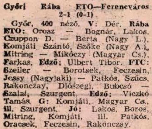 Nem volt egy sulycsoportban a két zöld-fehér együttes. A Ferencváros játékban, gyorsaságban, taktikában magasan fölötte állt a Rábának, amely hazai pályán volt kénytelen elviselni a megalázó vereséget.