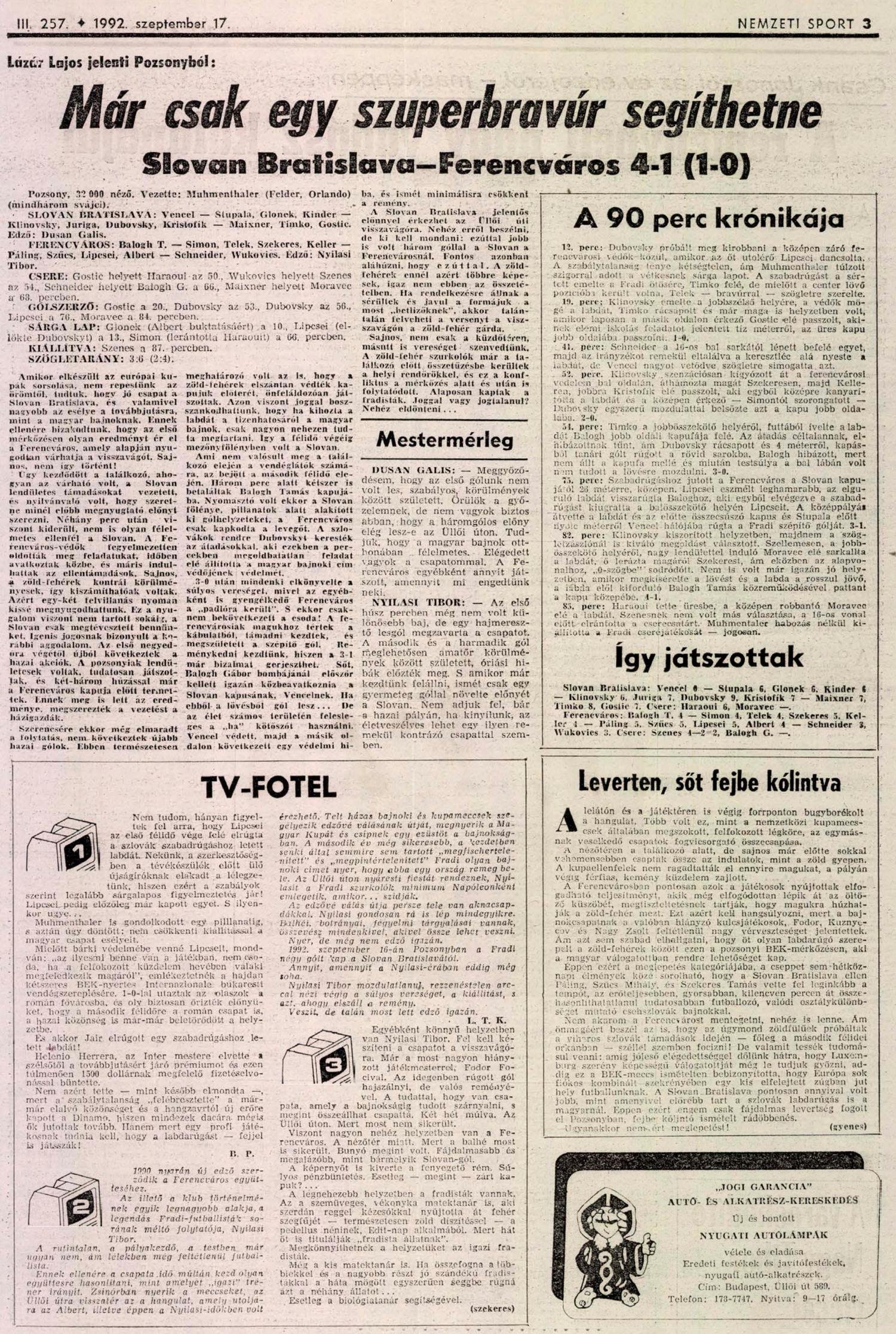 1992.IX.16. BL selejtező, Slovan Bratislava – Ferencváros 4-1
