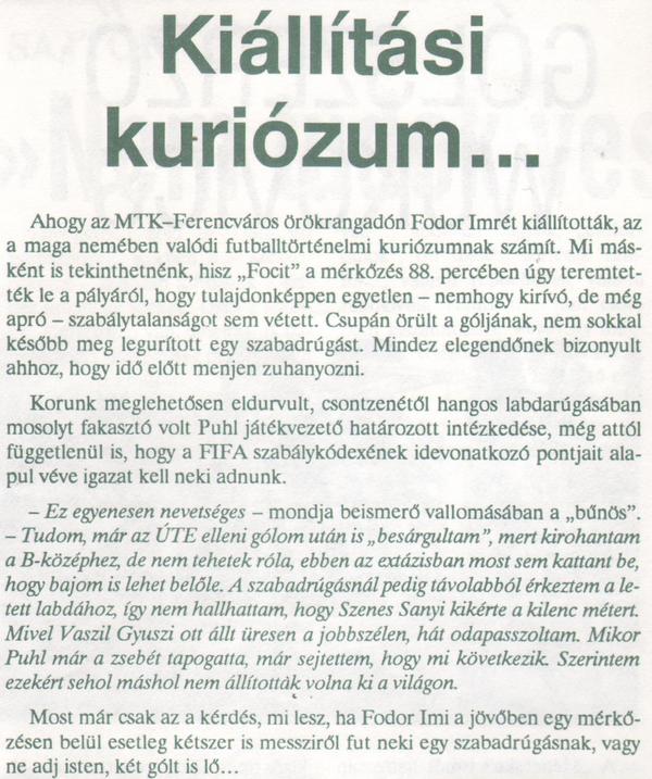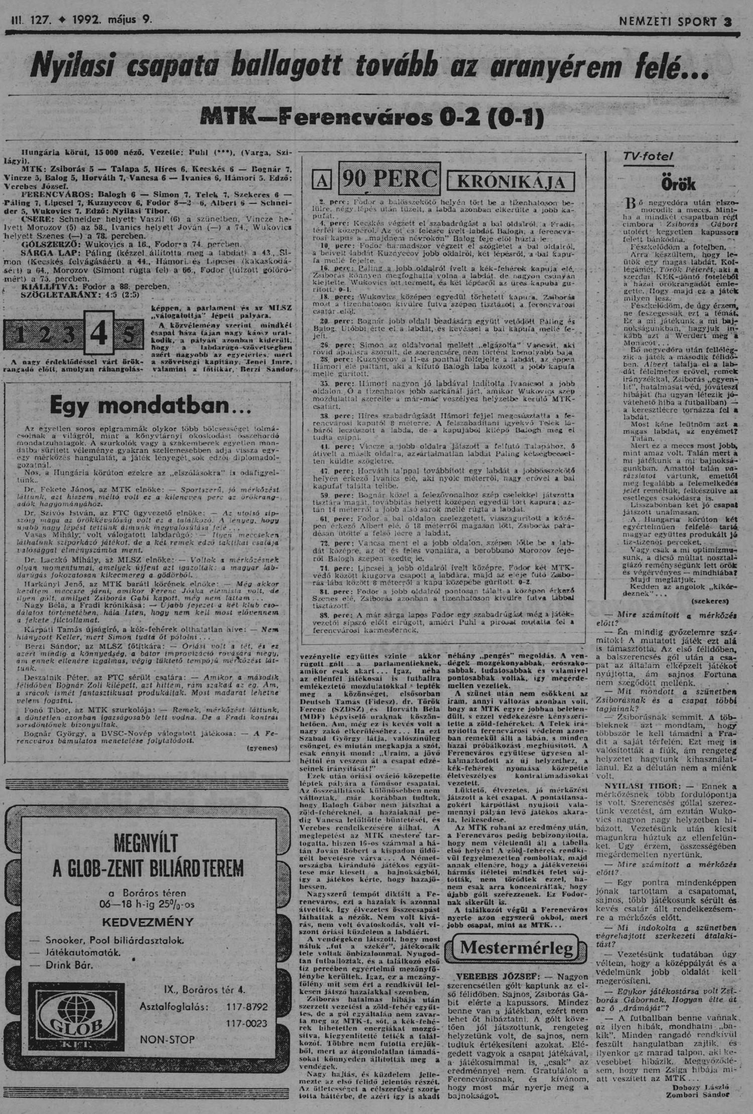 … A folytatásban az MTK elleni találkozóról ejtettek szót. Sem Havasi Mihály szakosztályvezető, sem Albert Flórián, a szakosztály elnökhelyettese nem tippelt, és óvott attól, hogy már most valaki is bajnoknak kiáltsa ki Nyilasi Tibor vezetőedző gárdáját. Ők tartanak ettől a mérkőzéstől. Persze, mondták, jó lenne újabb két ponttal gyarapodni. Talán jobb lett volna a Népstadionban lejátszani ezt a csatát, ám a Kispest-Honvéd FC nem akart kettős rangadót, a piros-feketék inkább a Bozsik-stadionban küzdenek pénteken. Brünyi Béla, az MTK szakosztályvezetője utánajárt, mennyibe is kerülne a Népstadionban a vendégeskedés. Túl sokba – ez a következtetés, így hát a Hungária körútra várják el a szurkolókat.