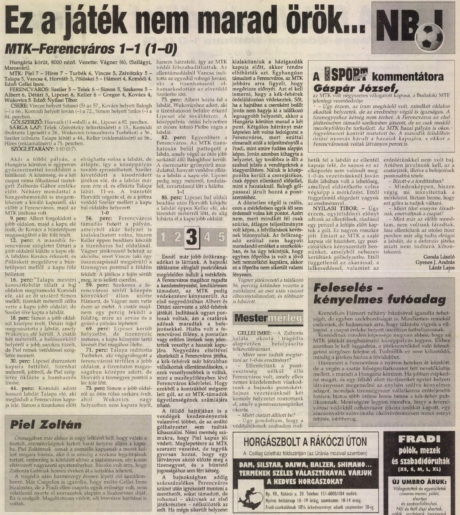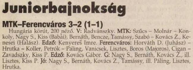 MTK: Piel – Híres – Talapa J., Vincze J. (Sztanó 57.) – Horváth Cs., Turbék, Vancsa, Pölöskei, Zsivótzky – Hámori, Komódi (Jován 71.)
