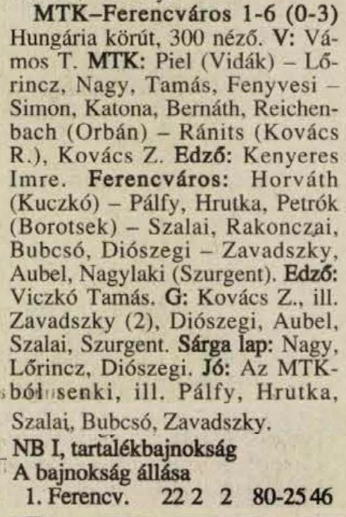 MTK: Zsiborás – Híres – Turbék, Sztanó, Keresztúri – Talapa, Balog, Vancsa, Zsivótzky (Vincze 60.) – Hámori, Szabó T. (Nagy 67.)