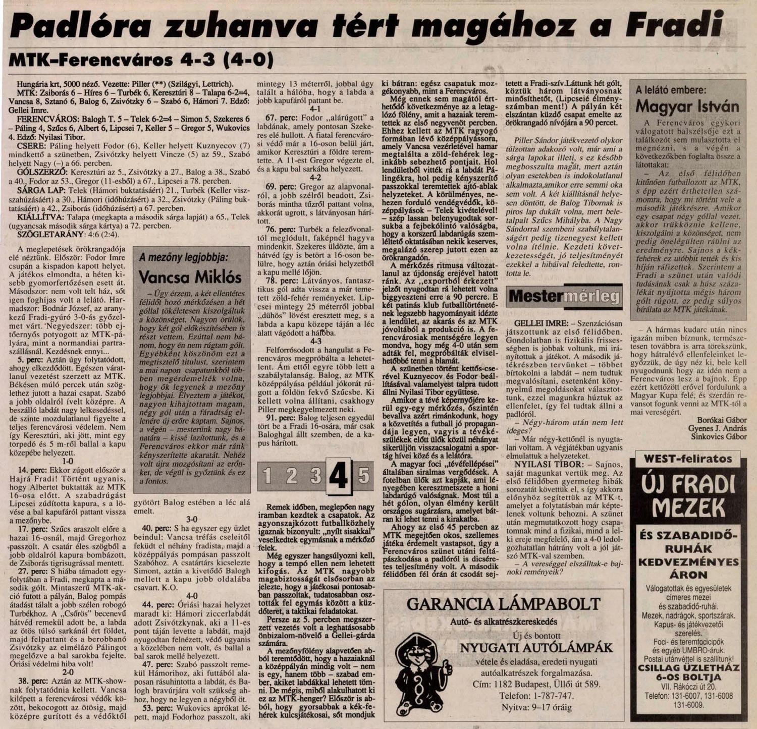 A vasárnapi NB I-es pontcsata MTK-rohamokkal keződött, s ennek az 5. percben meg is lett az eredménye. Szabó jobb oldali szögletére a kapus nem mozdult ki, és a védők közé berobbanó Keresztúri az ötösről a hálóba vágta csapata vezető gólját (1:0). Ez után a vendégek kezdeményeztek többet, a 15. percben Lipcsei szabadrugásból a kapufát találta el – ez volt az első ferencvárosi helyzet. Három perc múlva Gregor tört be a 16-oson belülre, lövését azonban Zsiborás kitenyerelte. A 28. percben növelte előnyét az MTK. Balog szöktette a jobb oldalon Turbékot, akinek beadására a hosszú saroknál Zsivótzky érkezett, s a tétovázó Páling mellől a kapuba fejelt (2:0). A 39. percben Gregor lövése centiméterekkel szállt mellé, de ezután újra hazai gólok következtek. A 41. percben Vancsa ügyesen kényszerítőzött Hámorival, majd középre gurított, s az érkező Balog a hálóba kotorta a labdát (3:0). Két perc múlva Szabó lépett ki a védők közül, majd ügyesen elcsavarta Balogh mellett a labdát (4:0). A lefújás előtt még Hámori tálalt Zsivótzy elé, aki azonban 8 m-ről kihagyta az ajtó-ablak helyzetet.