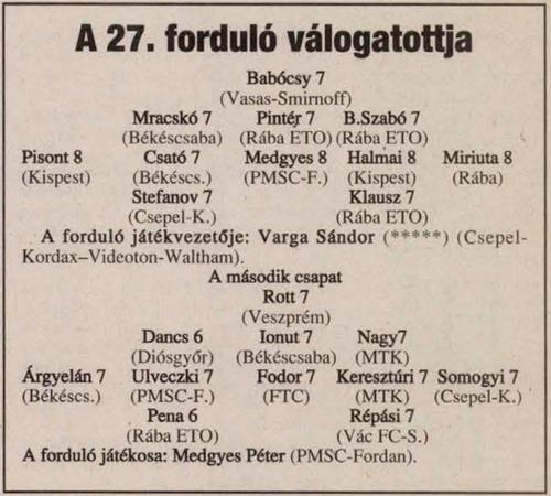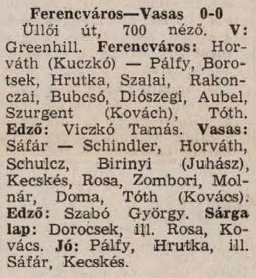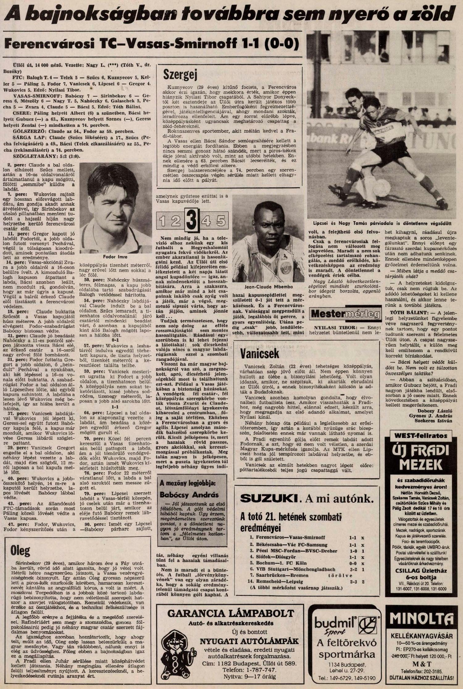 Vasas-Smirnoff: Babócsy – Geress (Zentai 74.), Sirinbekov, Mészöly, Pecha – Nagy T., Nahóczky, Galaschek – Zvara, Bácsi (Gubucz 63.), Claude