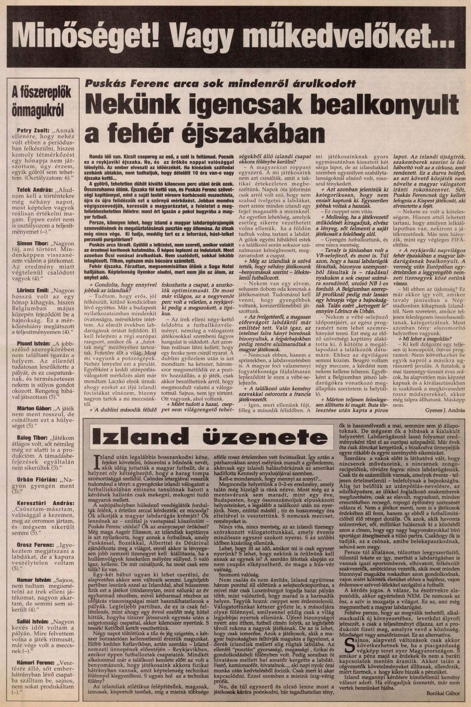 A sok-sok szürke magyar teljesitmény kellemetlen, de már nem uj tény. Mindössze Petry dicsérhető, még akkor is, ha a második gólban benne volt. Ujabb olyan mérkőzésen van tul a magyar együttes, amelyet gyorsan feledni kell. Izland második győzelmét szerezte a csoportban, mondani sem kell, hogy az elsőt is Magyarország ellen ,,söpörte,, be – több mint egy éve, a Népstadionban. A vendég válogatott közelébe sem került annak a második félideji teljesitményének, amelyet május végén Dublinban, az irek ellen mutatott. Azzal talán megmenthette volna az egyik pontot, ugyanugy zárójelben felvethető a kérdés: Détárival, aki nagyon szeretett volna játszani Reykjavikban, talán többre vitte volna a Puskás-csapat. Annak ugyanis nem volt irányitója. A hazaiaknál a három emlitett ék mellett Bergsson és R. Kristinsson mutatott emlékezeteset.