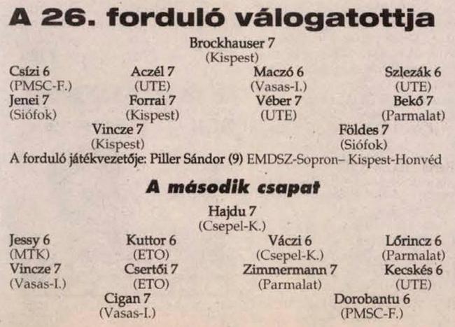 Újpesti TE: Praj – Aczél, Szlezák, Molnár Z., Kozma – Kecskés, Turi, Véber, Bérczy – Kovács L. (Szanyó 87.), Belvon (Horváth P. 74.)