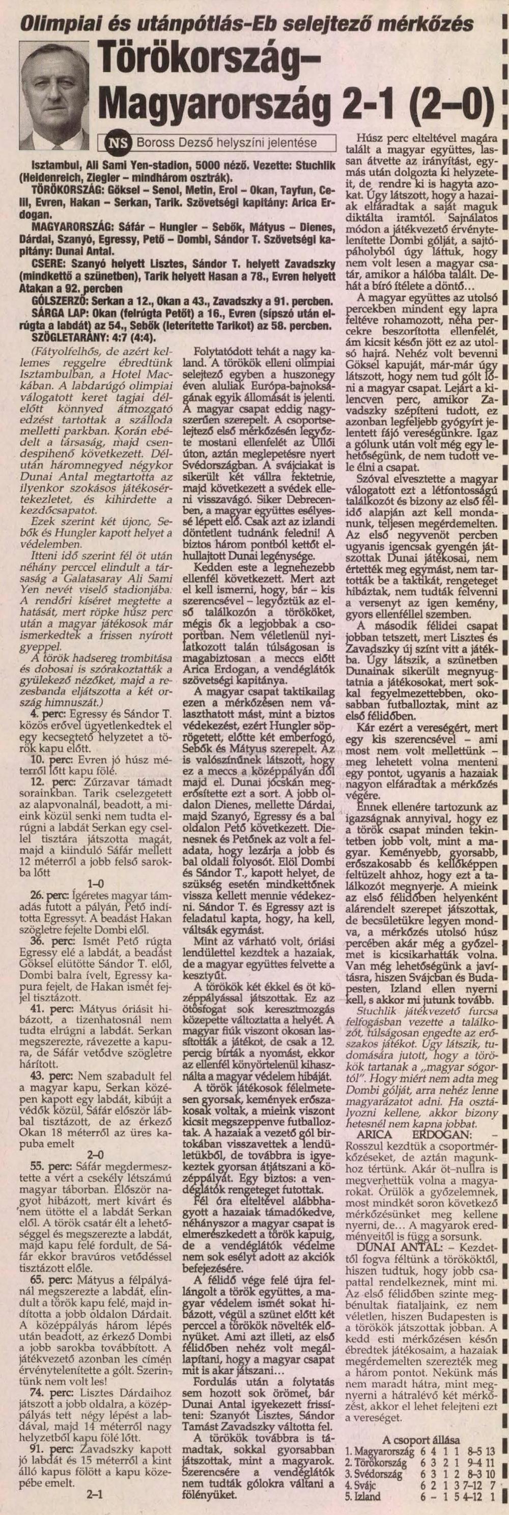 Isztambulban szerdán a futball elhomályosított mindent. A „félholdas” labdarúgó-válogatott a helyi lapok szerint története legfontosabb mérkőzését játszotta, hiszen eddig sohasem sikerült továbbjutnia az Európa-bajnoki vagy világbajnoki selejtező csoportból. Most elérhető közelségbe került a kontinensbajnokság 16-os döntőjébe jutás, s ehhez szerdán a magyar válogatottat kellett legyőzni. Ez egyébként eddig egyetlen alkalommal, 1956-ban sikerült nekik, pedig akkor még Puskás Ferenc is ott volt a pályán. Azt a mérkőzést a törökök úgy emlegetik, mint a magyarok a londoni 6-3-at, s most ennek a fegyverténynek a megismétlésére készültek.