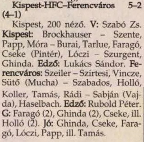Kispest-Honvéd FC: Vezér – Plókai, Hahn, Gabala – Árgyelán, Kovács B. (Dubecz 46.), Bárányos (Moses 78.), Urbányi, Warzycha, Piroska – Kabát (Herczku 81.)
