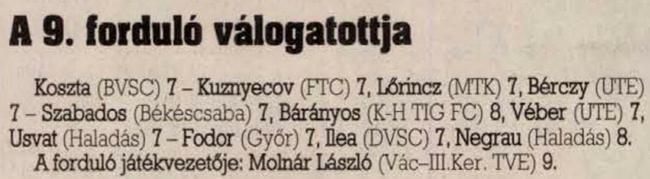 9 gólos: Sándor T. (DVSC-Epona), Kenesei K. (MTK FC)