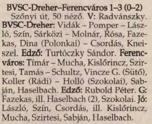 BVSC-Dreher: Koszta – Csábi, Komlósi, Bondarenko – Komódi, Bükszegi, Zováth, Dárdai (Bognár 46.), Aranyos, Farkas – Orosz (Potemkin 46.)