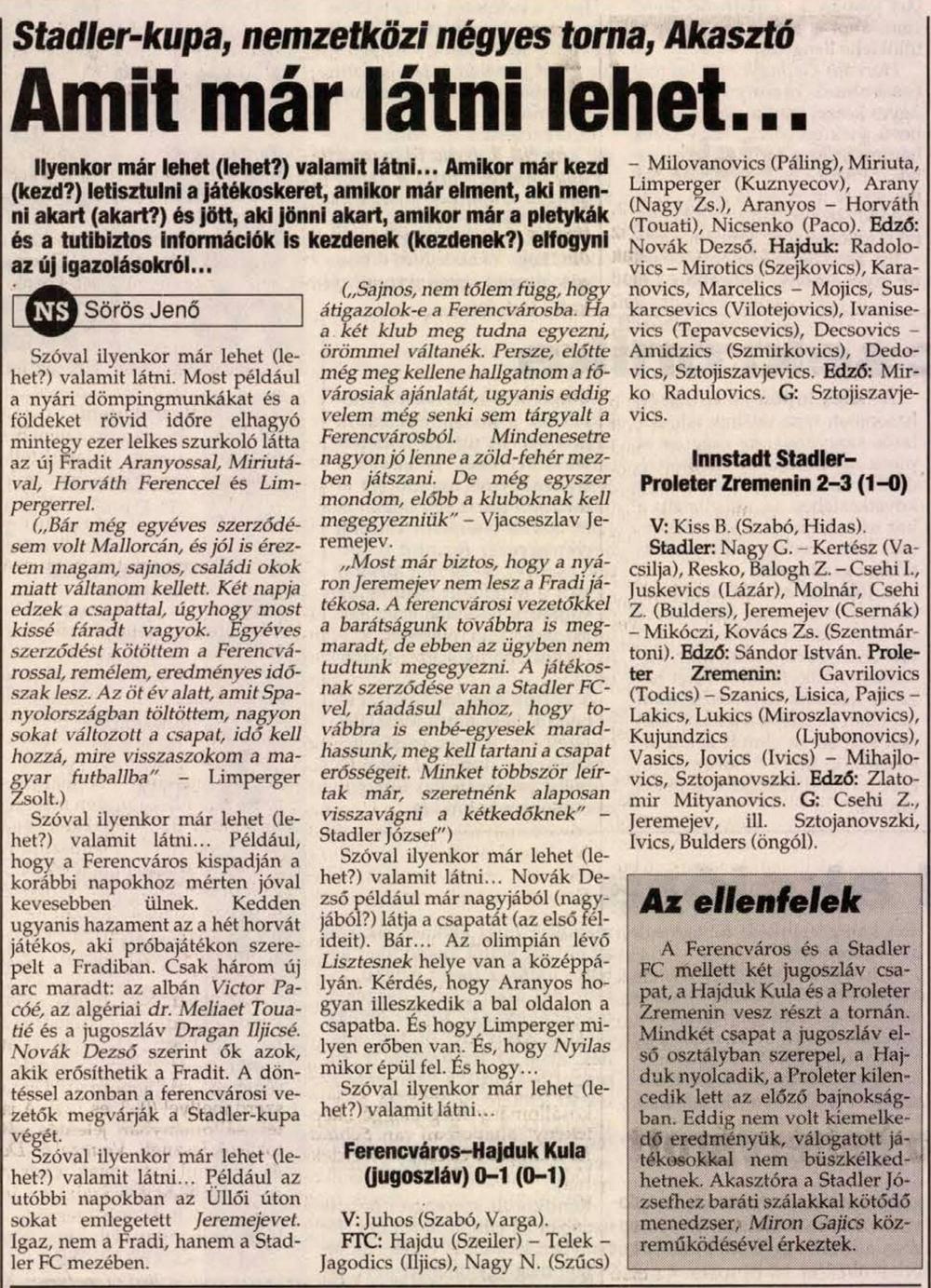 1996.VII.17. Stadler Kupa, Ferencváros – Hajduk Kula 0-1
