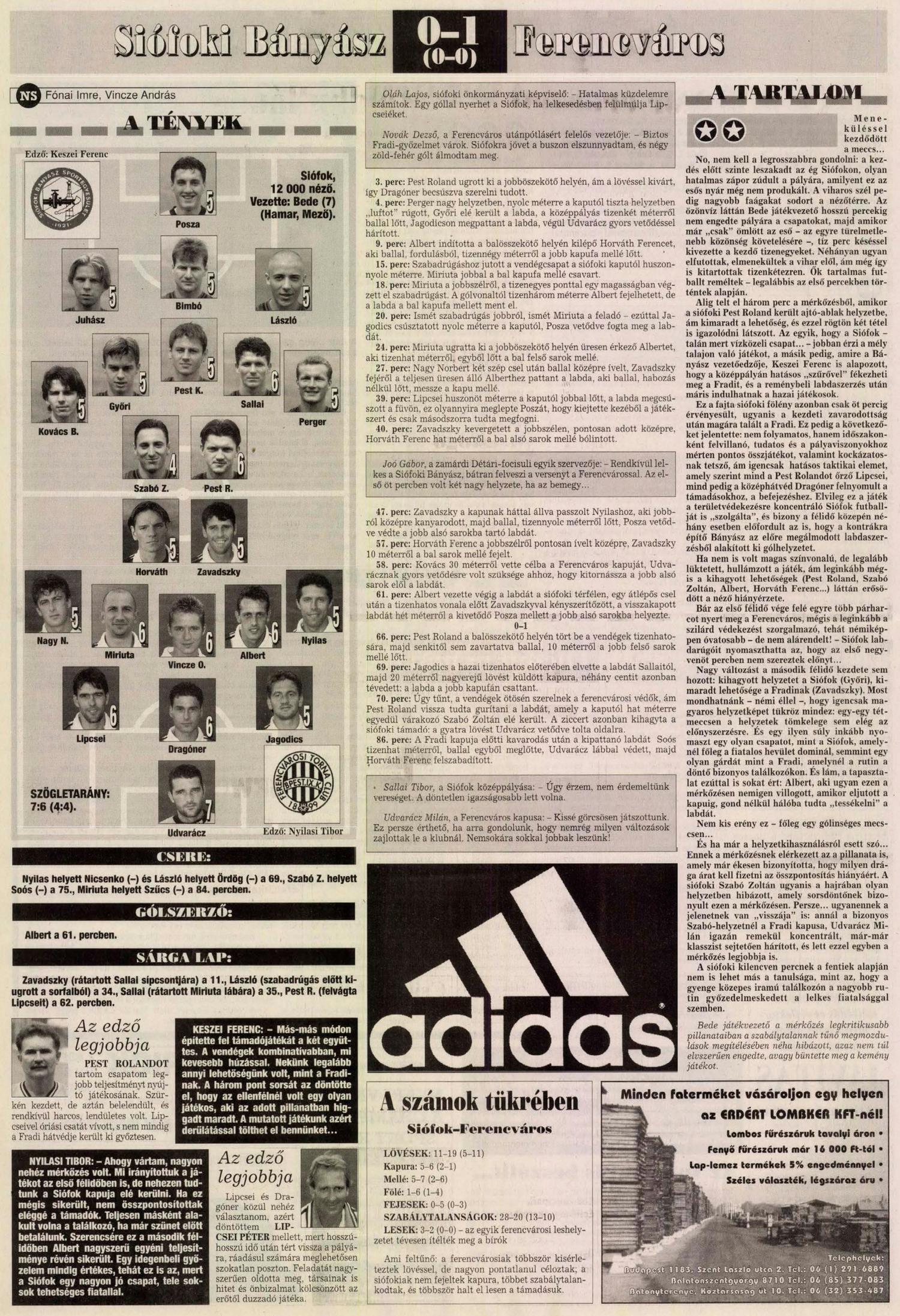 Szünet után a Ferencváros átvette a játék irányítását, sok veszélyes támadást vezettek a zöld-fehérek, és sok esetben kellett a siófoki kapusnak, Poszának óriási védéseket bemutatnia. A 63. percben egy kapu előtti kavarodásnál Albert elé pattant a labda, aki azt két méterről a kapuba kotorta (0-1). A gól után a Ferencváros kiengedett egy kicsit, a siófokiak kezdtek akciókat vezetni, a szerencsével azonban hadilábon álltak, mert vagy kísérleteik voltak pontatlanok, vagy a jókor közbelépő Udvarácz védett nagyokat.