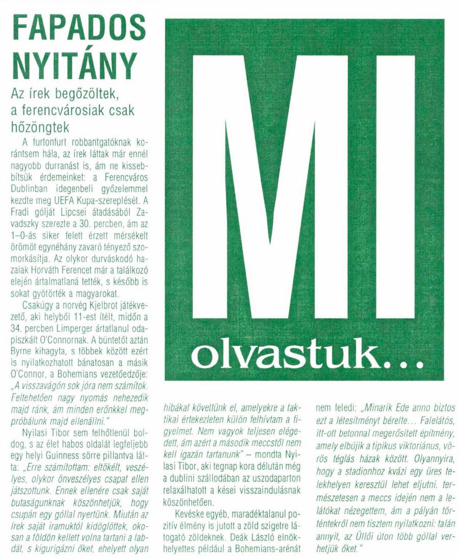 A Ferencváros labdarúgó csapata idegenben kezdte meg nemzetközi kupaszereplését. Az UEFA-kupa előselejtezőjének első mérkőzését Írországban a Bohemians Dublin otthonában játszotta a magyar együttes és egygólos győzelmet aratott.