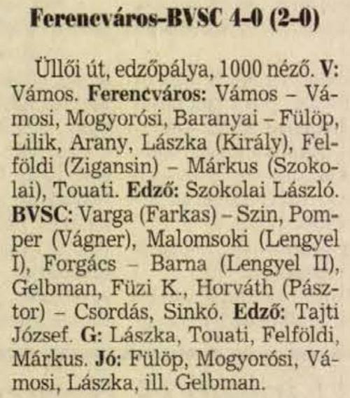 Ferencváros: Udvarácz – Dragoner – Jagodics, Szűcs M. – Páling (Schultz 63.), Nyilas, Vincze, Albert, Nagy N. – Nicsenko, Zavadszky
