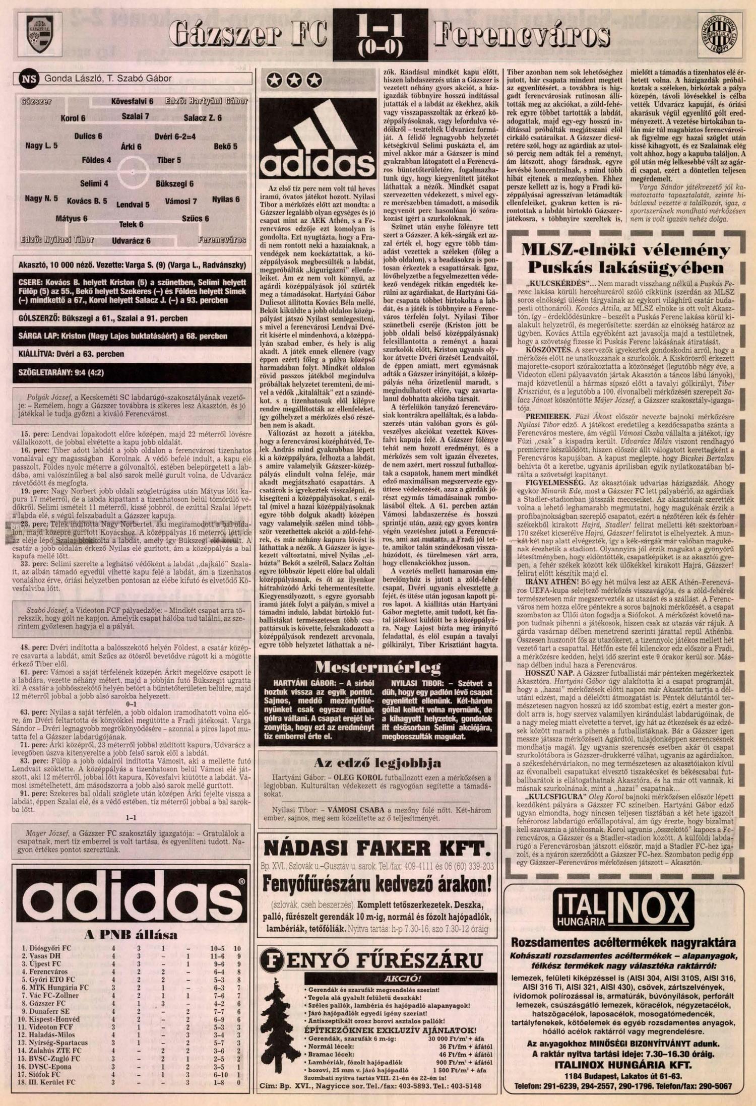 Az első félidő kicsit unalmasra sikeredett, a másodikra aztán felpörögtek az események. Nyilasi Tibor edző joggal bosszankodott, hogy csapata engedte a már padlón levő Gázszert felállni.