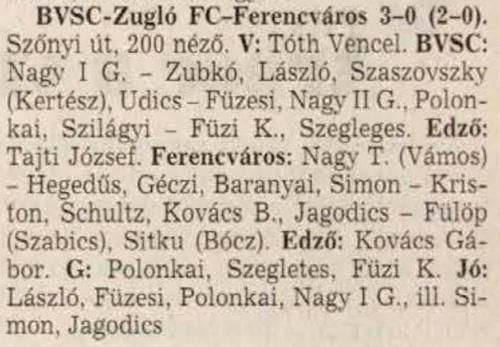 A Ferencváros megérdemelten nyerte meg a találkozót, mivel a második félidőben sok helyzetet dolgozott ki, ugyanakkor a BVSC-nek egyetlen komoly lehetősége sem volt a gólszerzésre.