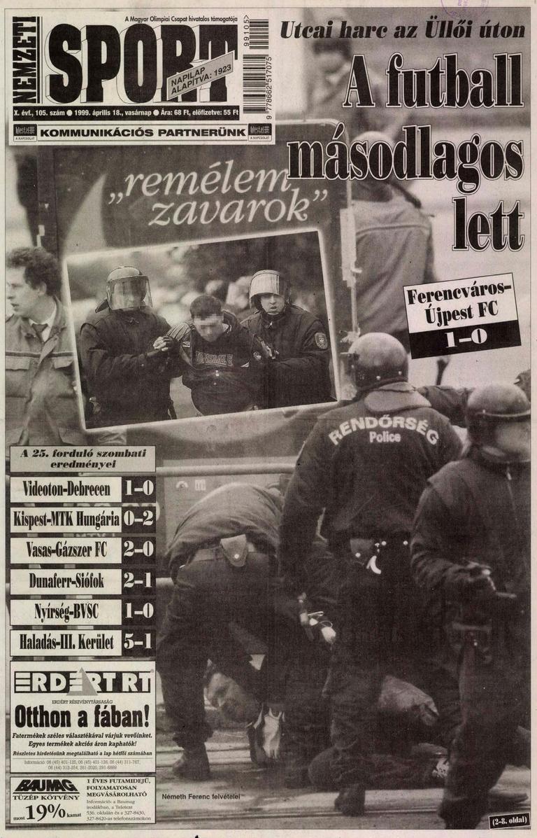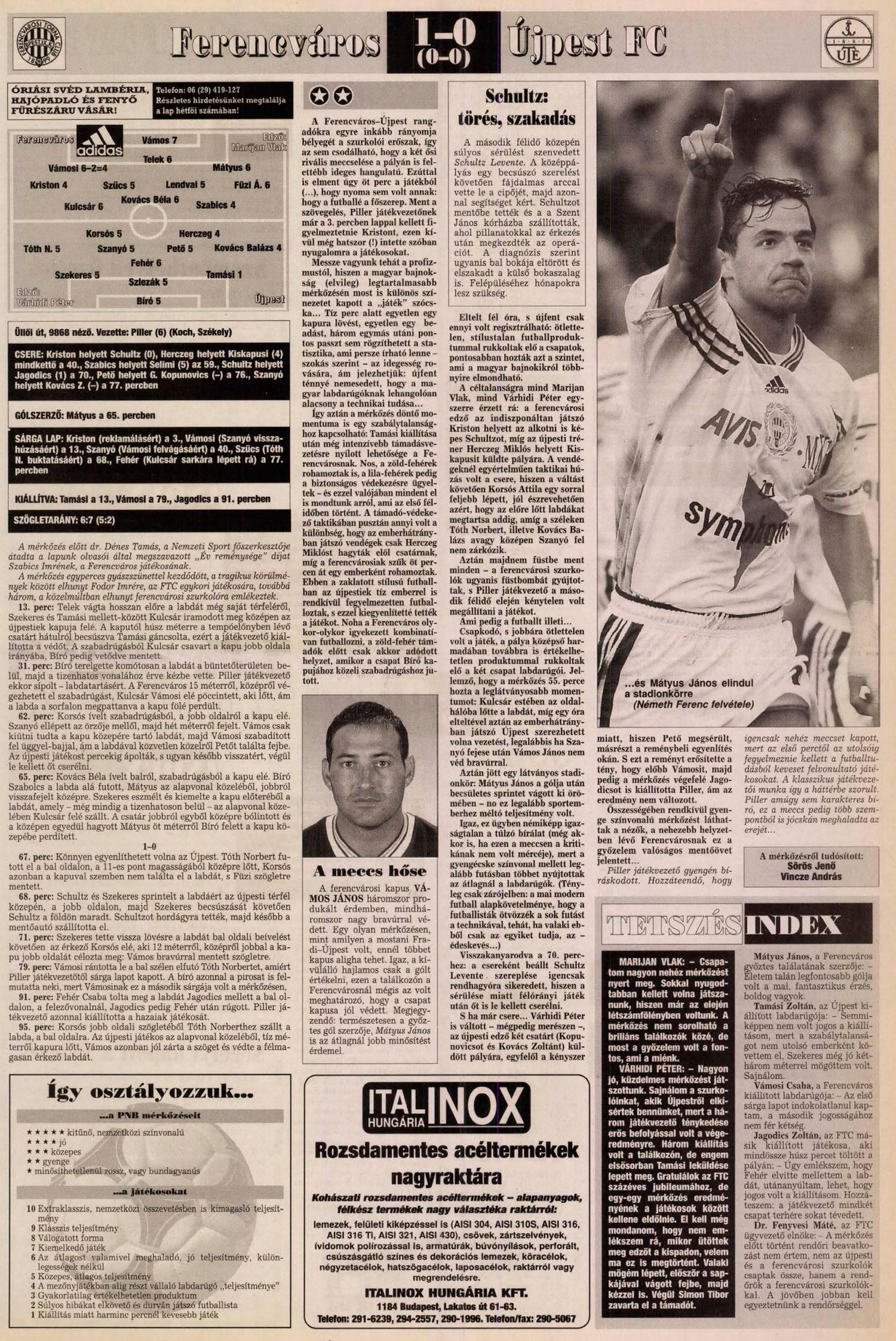 13-14. perc: Kulcsár futott Bí­ró kapus felé, a kaputól 18 méterre Tamási buktatta, Piller játékvezető kiállí­totta az újpesti védőt. Az í­géretes szabadrúgást a sértett végezte el, de a vendégkapus hárí­totta a lövést.