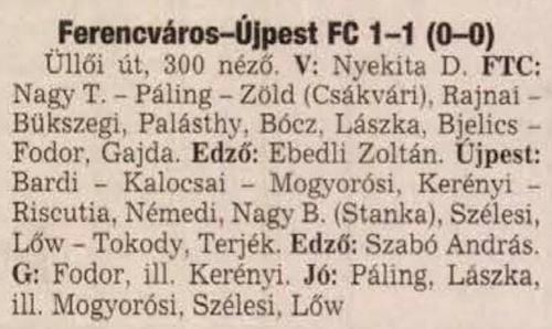 Újpest: Bí­ró – Tamási – Fehér, Szekeres – Kovács Balázs, Pető (Kopunovics 75.), Szanyó (Kovács Z. 78.), Szlezák, Tóth N. – Herczeg (Kiskapusi 40.), Korsós