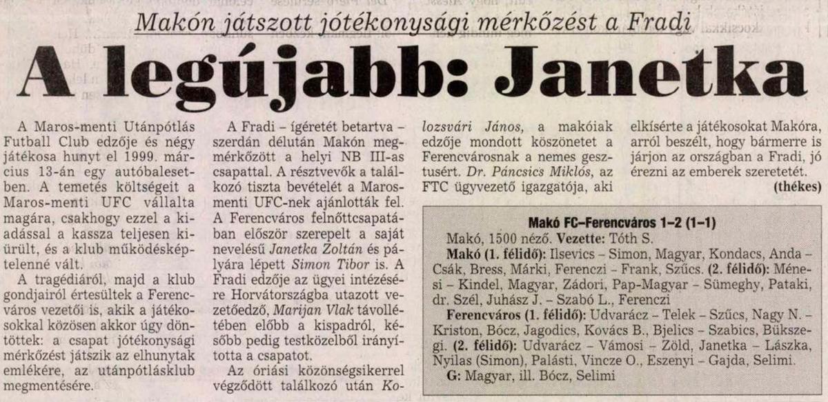 1999.IV.28. Makó – Ferencváros 1-2 (edzőmérkőzés)