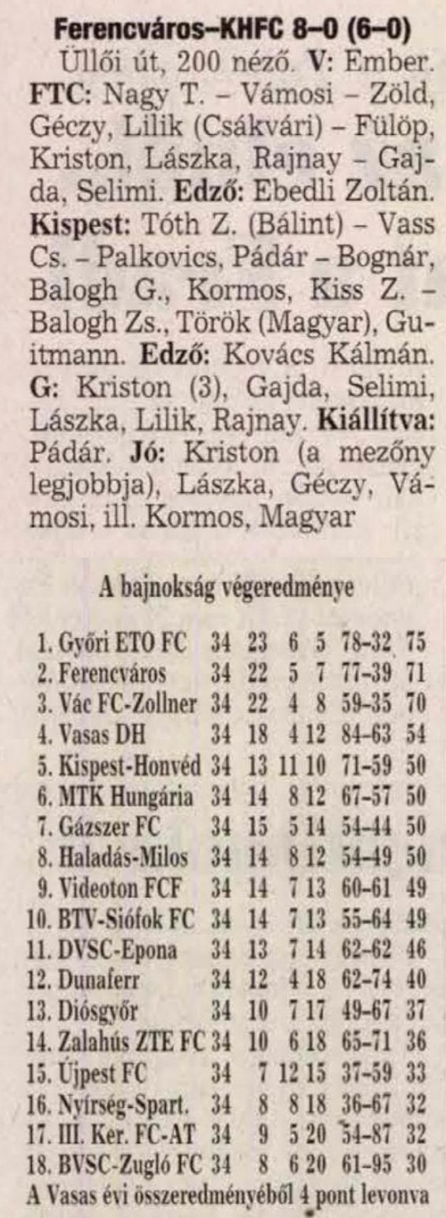 1999.VI.16. Ferencváros – Kispest-Honvéd 0-1